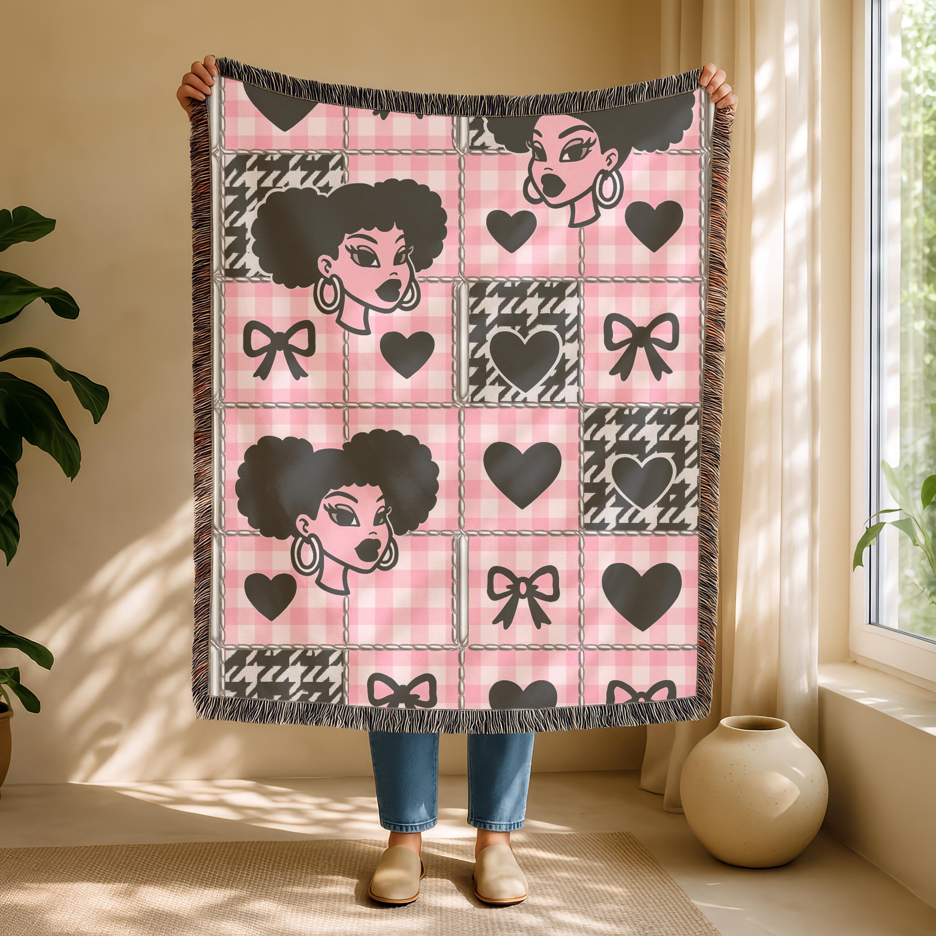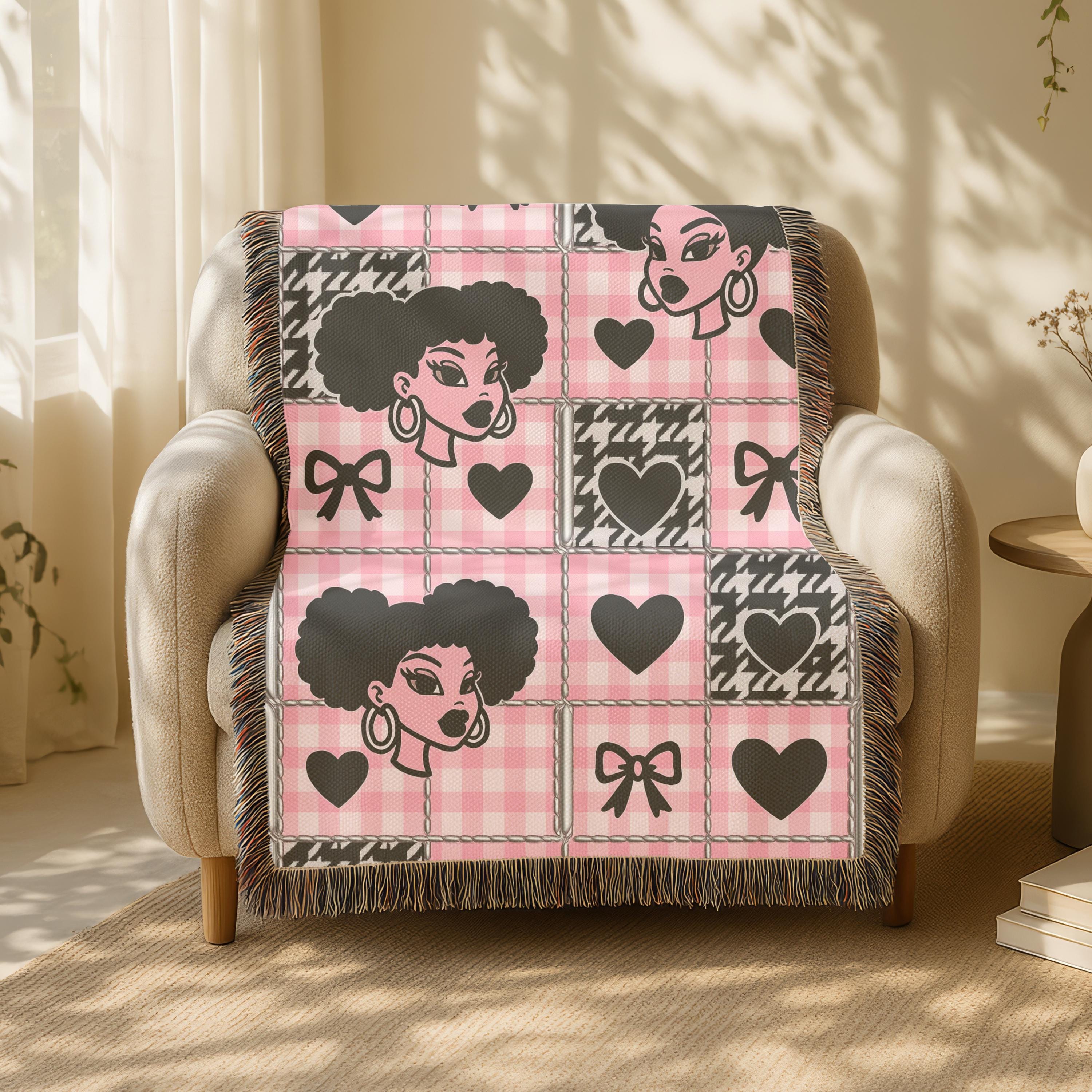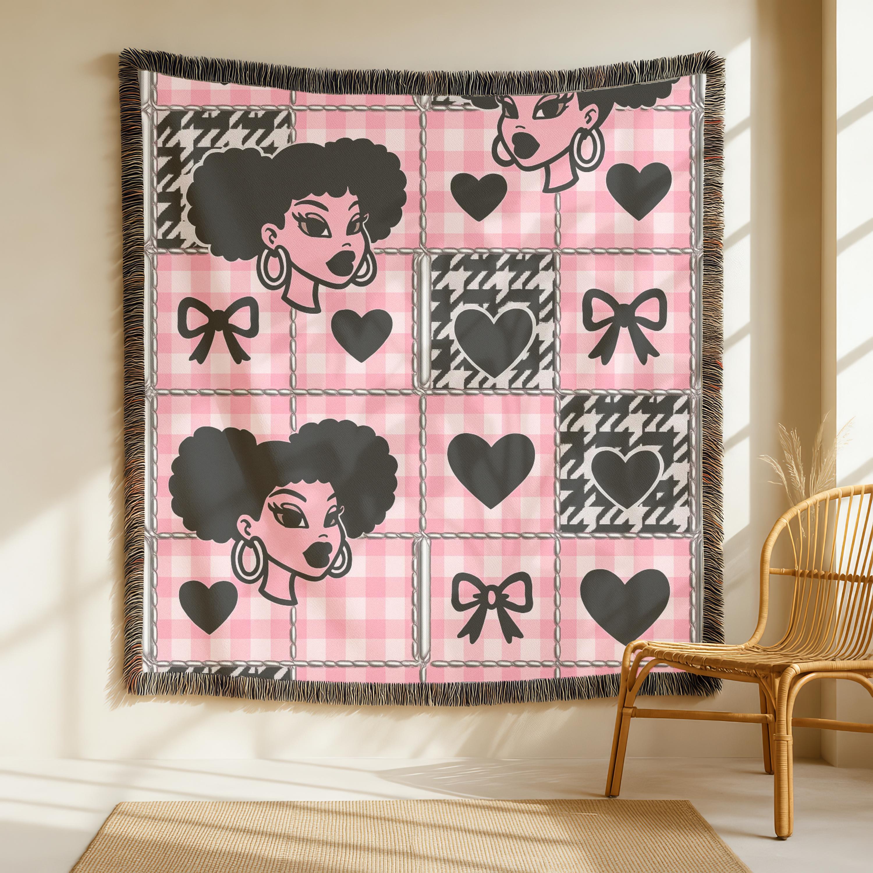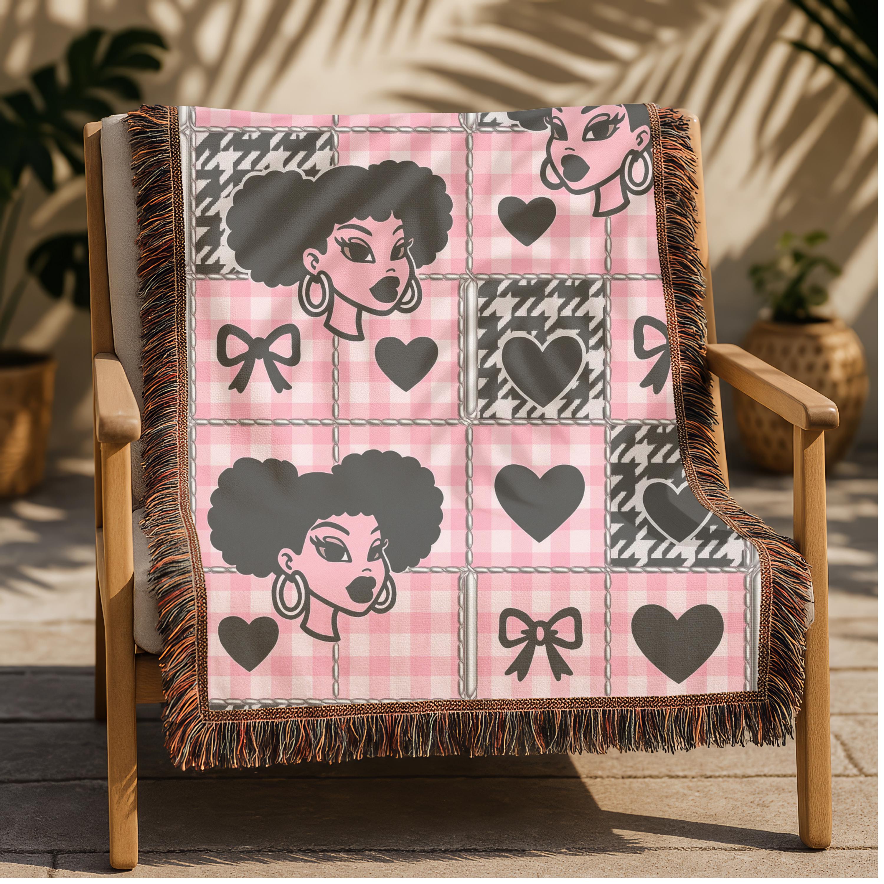 Celebrate black girl magic with this woven blanket featuring a black girl crown and pink checkerboard design. Perfect for adding a touch of empowerment and style to your home decor. Ideal for those who appreciate representation and empowerment in their decor. Relevant for Black History Month, Women's History Month, and everyday use.