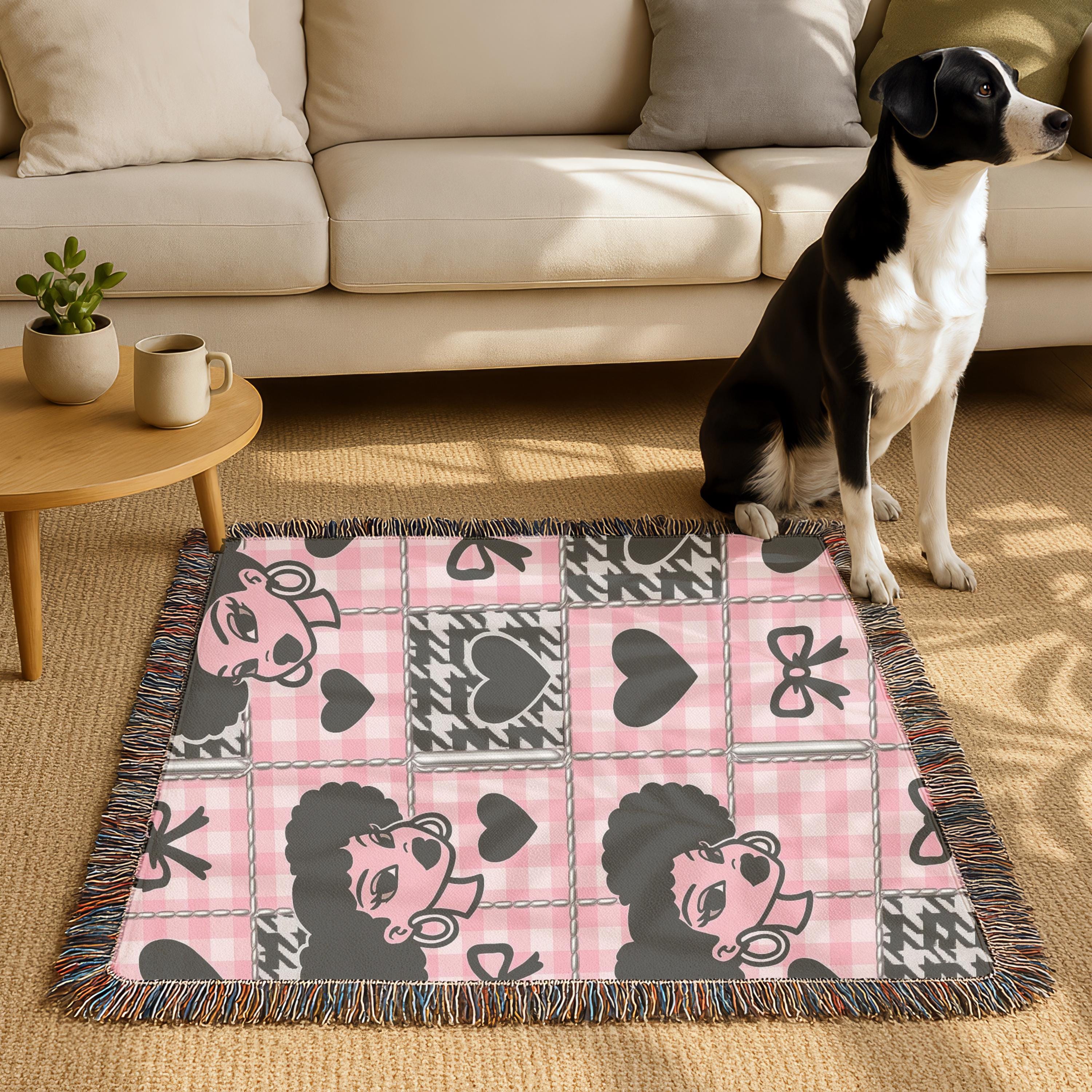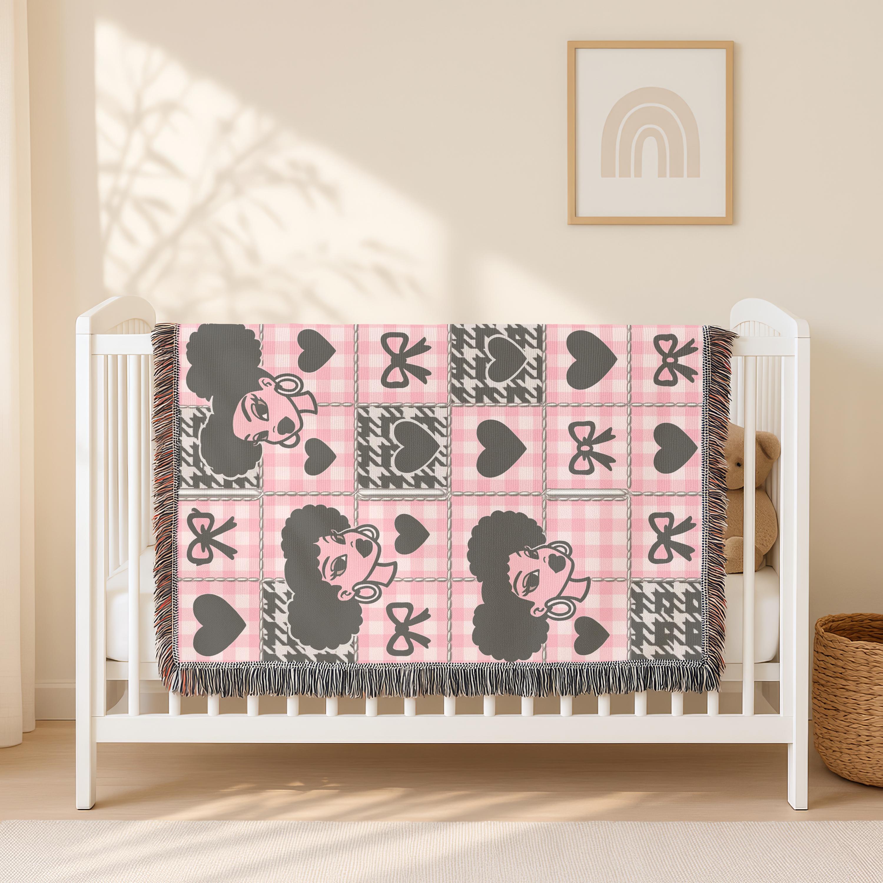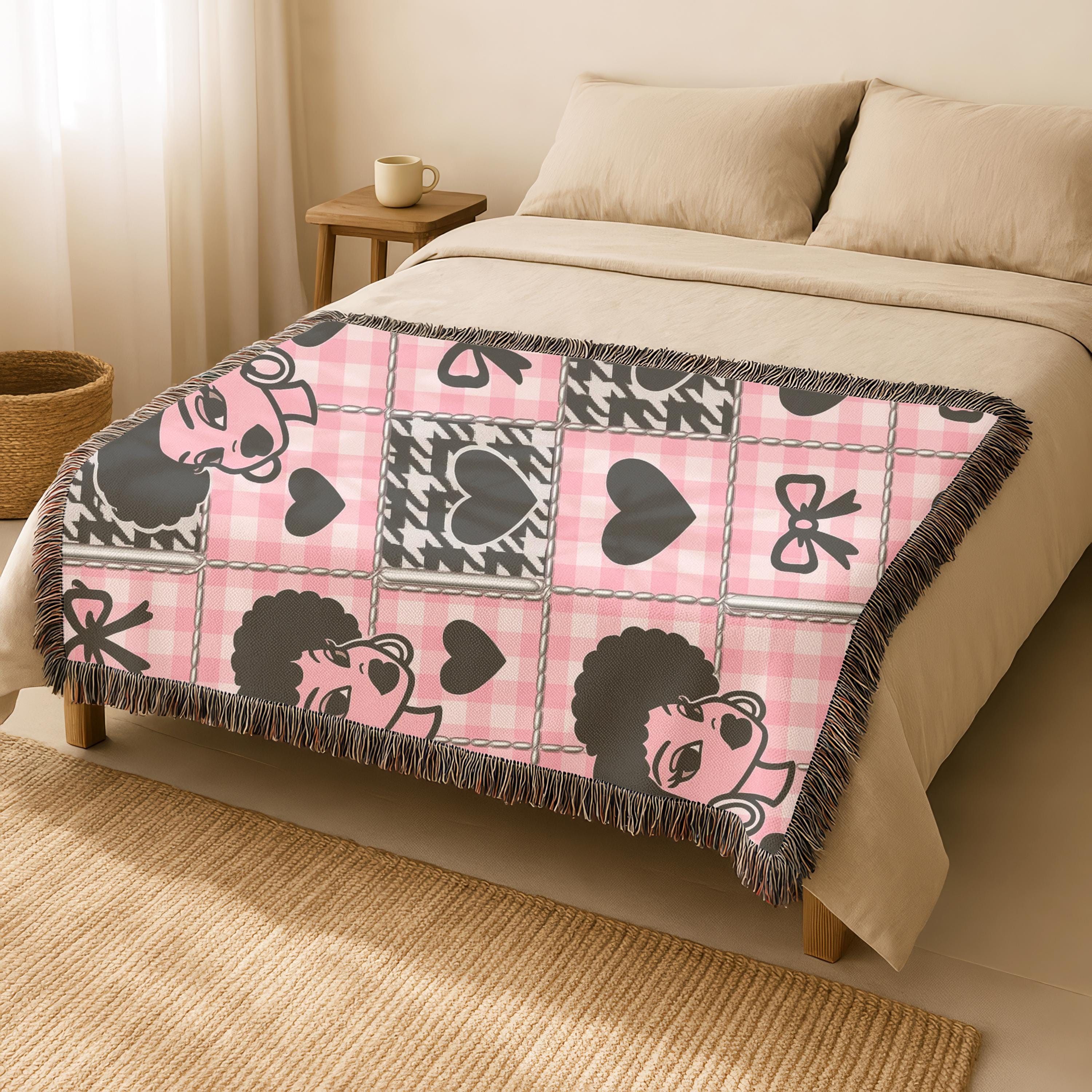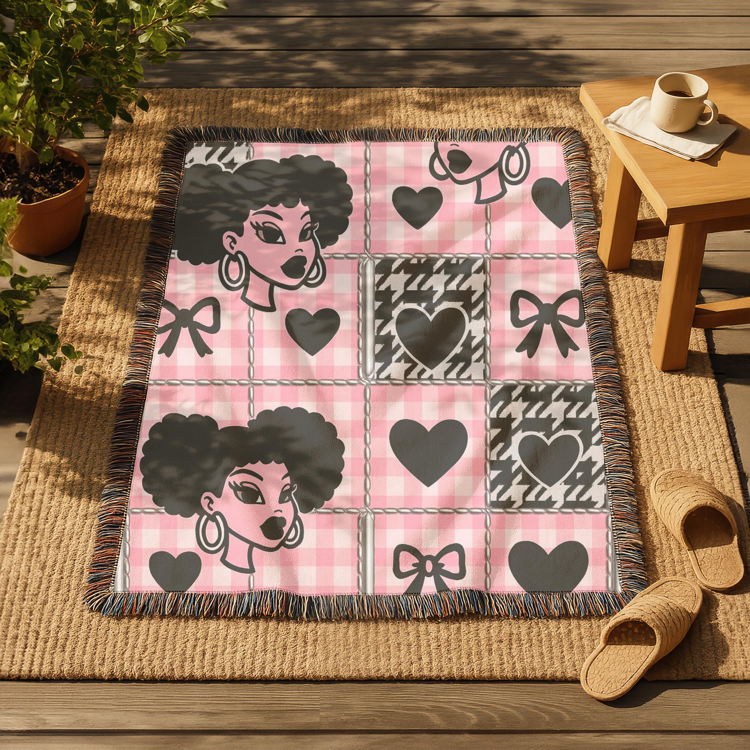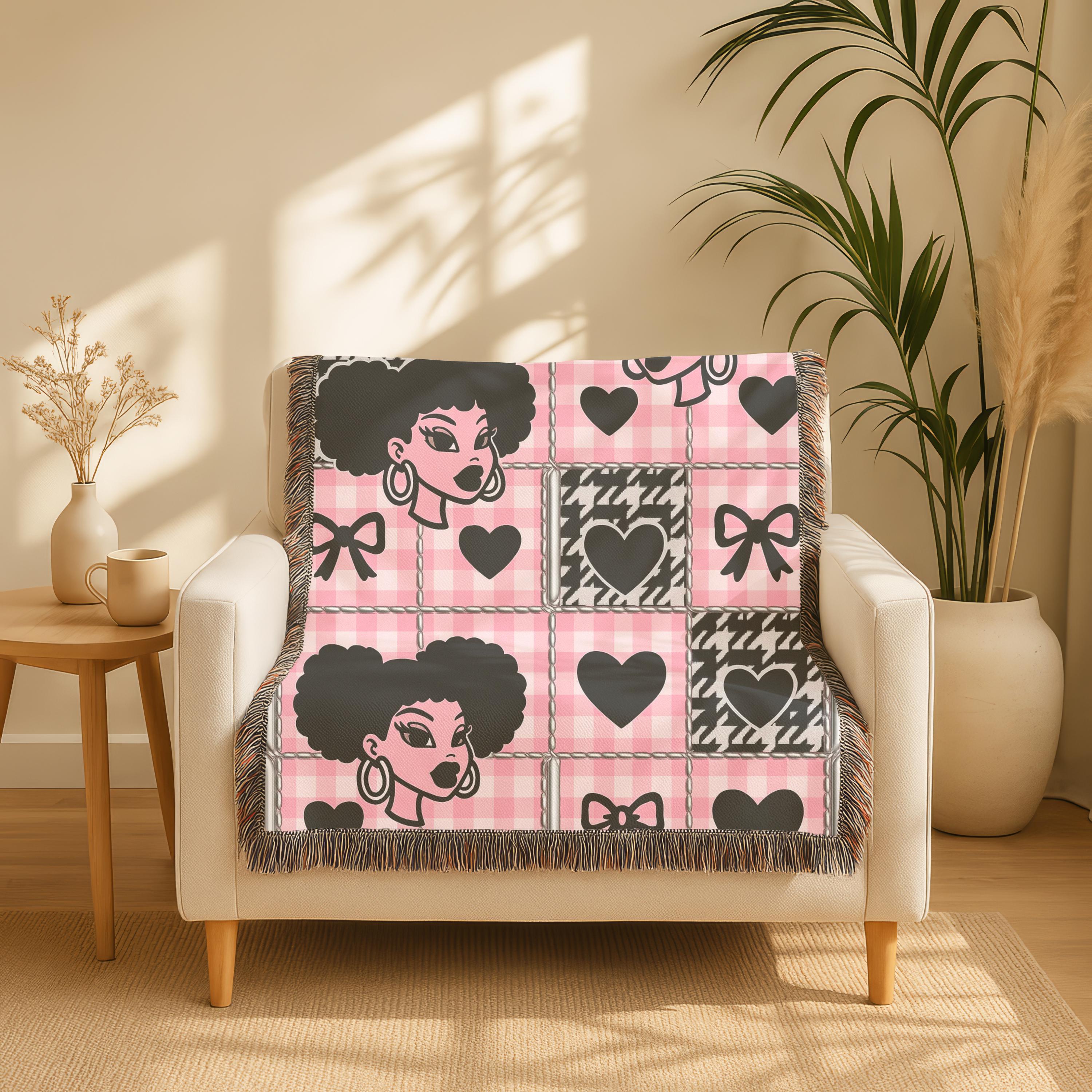 Celebrate black girl magic with this woven blanket featuring a black girl crown and pink checkerboard design. Perfect for adding a touch of empowerment and style to your home decor. Ideal for those who appreciate representation and empowerment in their decor. Relevant for Black History Month, Women's History Month, and everyday use.