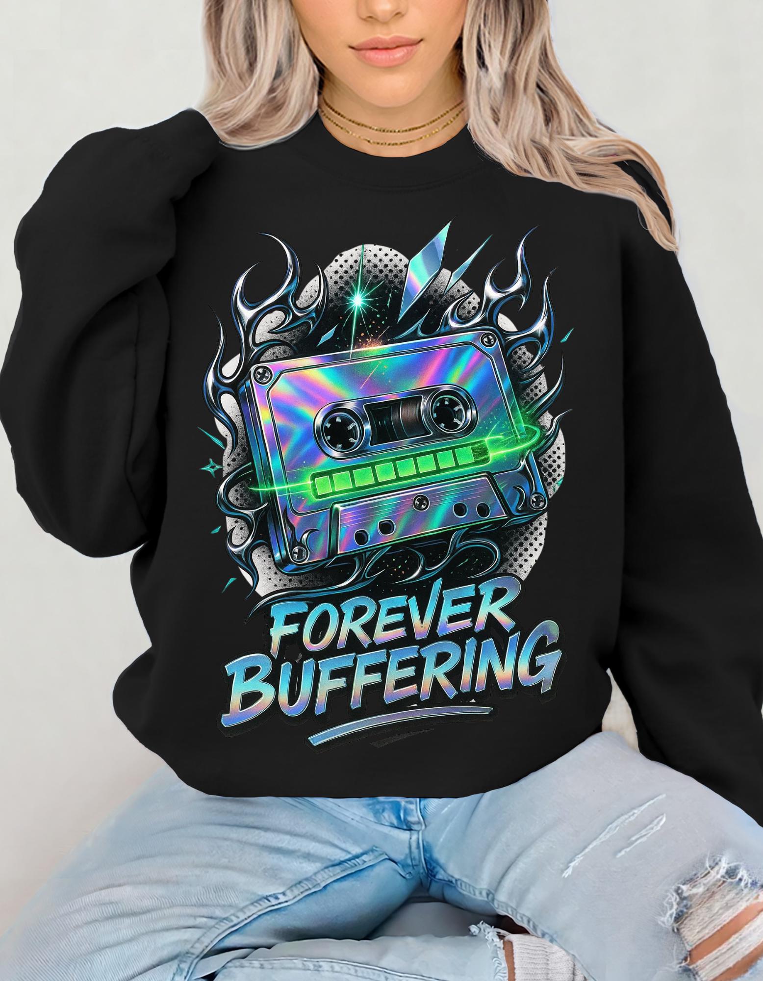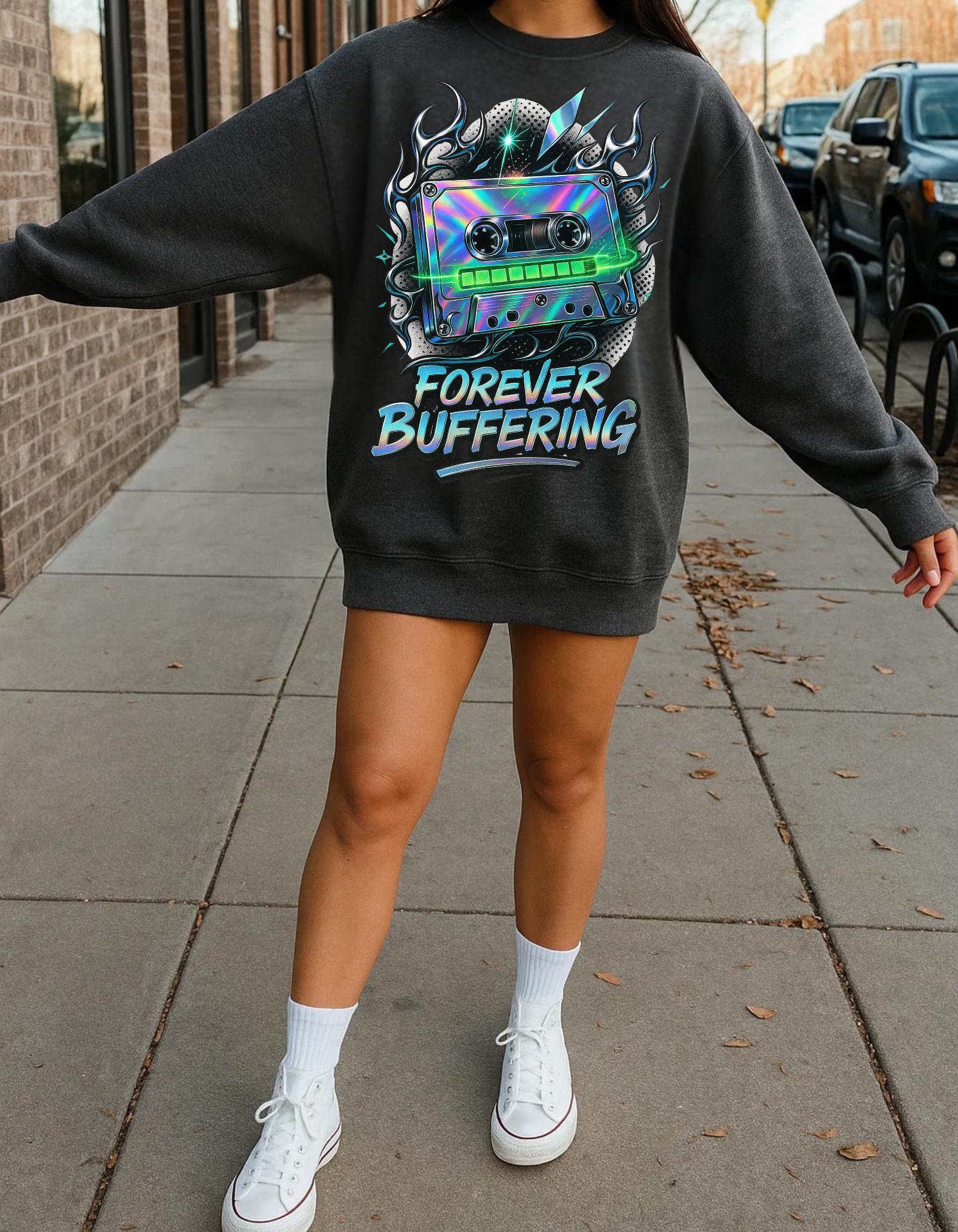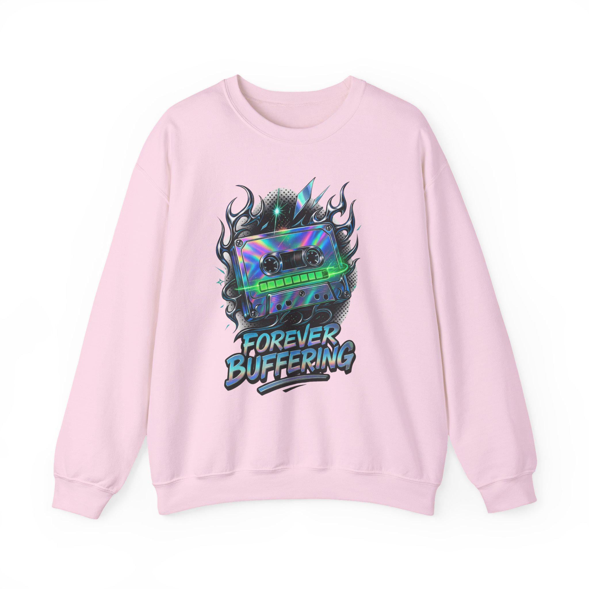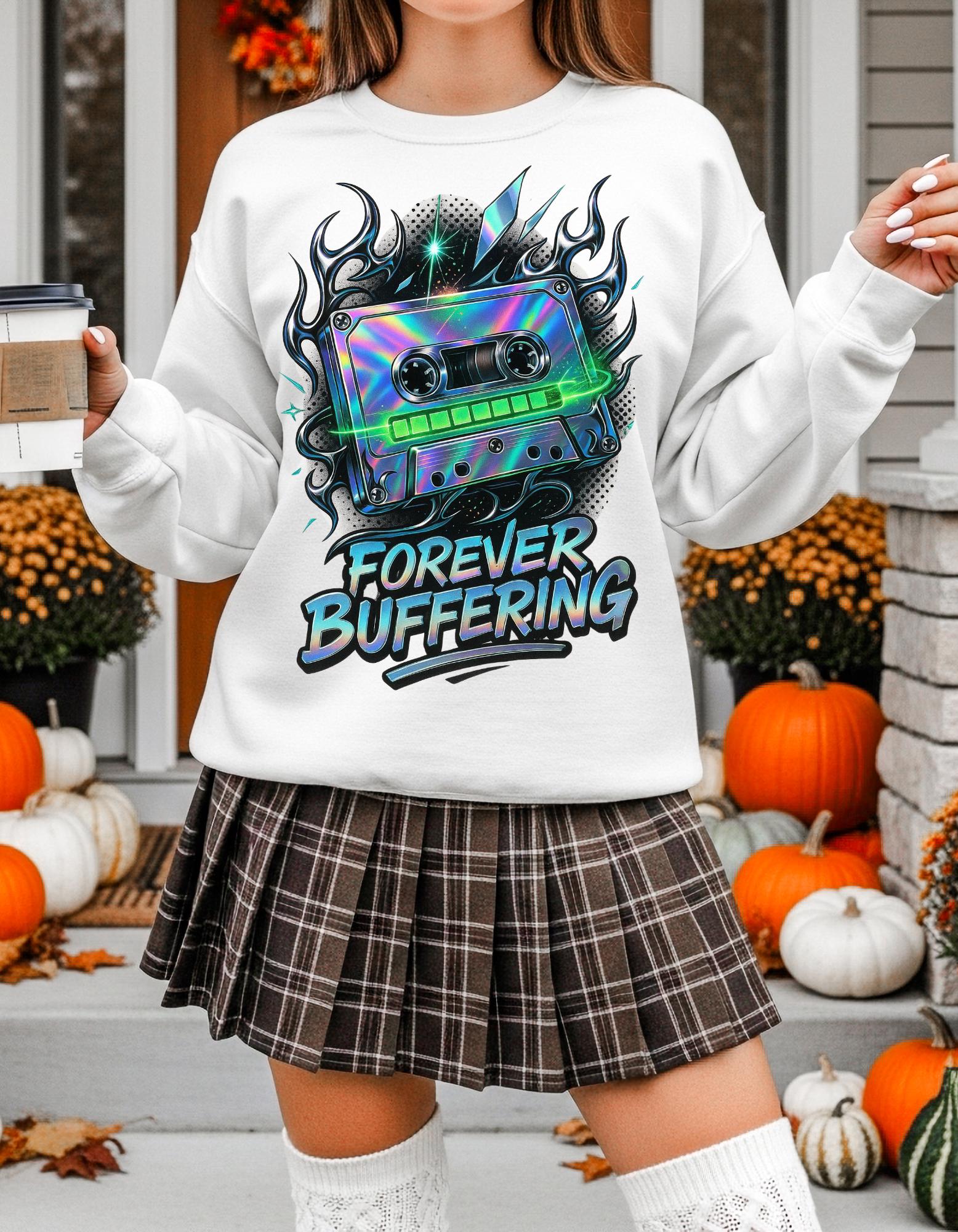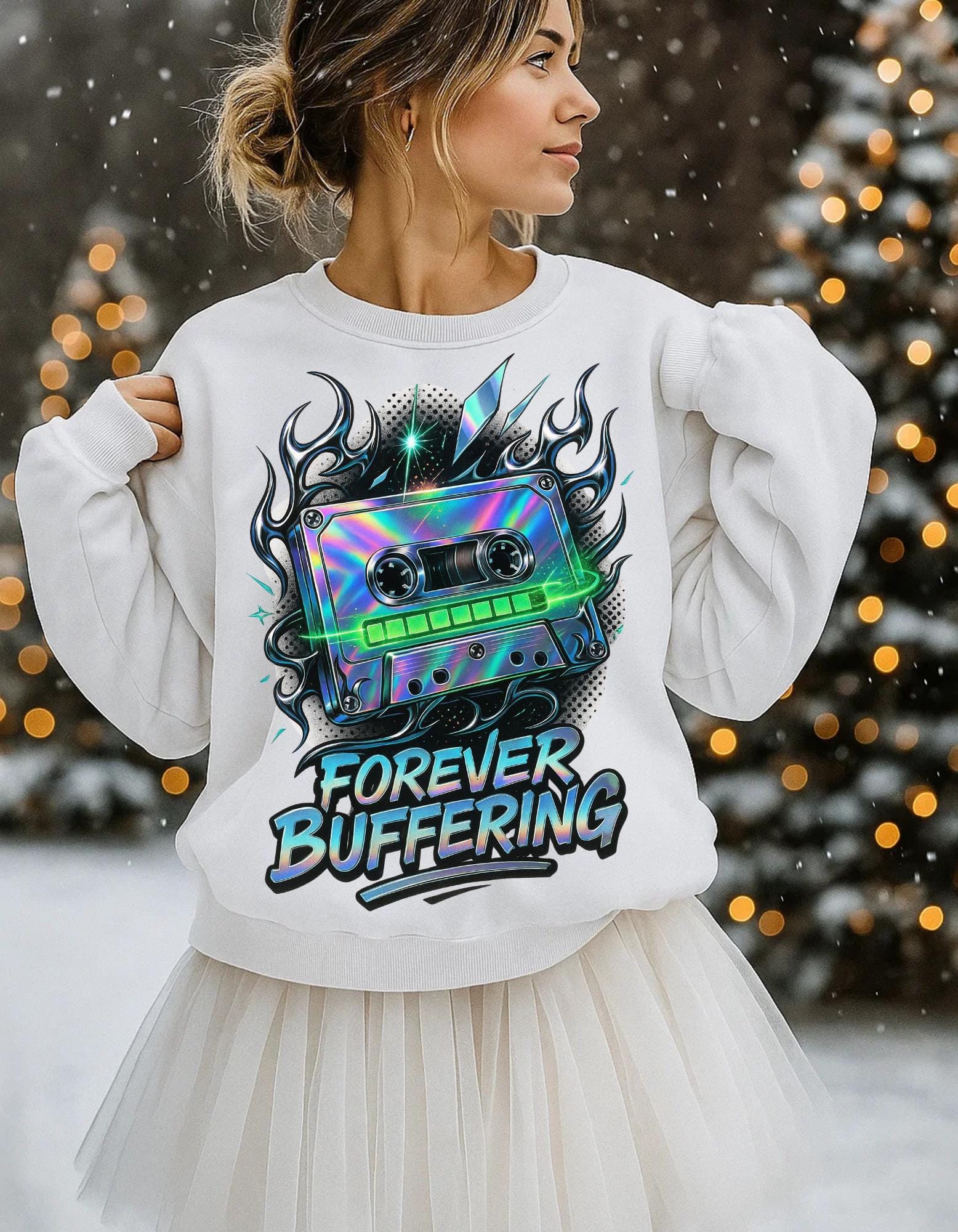 A nostalgic Sweatshirt featuring a design of MixedTape, forever buffering, y2k chrome. Perfect for those who love the Y2K aesthetic and want to relive the past. Ideal for adults looking for a comfortable and durable sweatshirt for everyday wear. Great for nostalgic holidays like Throwback Thursday or any casual occasion where you want to showcase your love for the early 2000s.