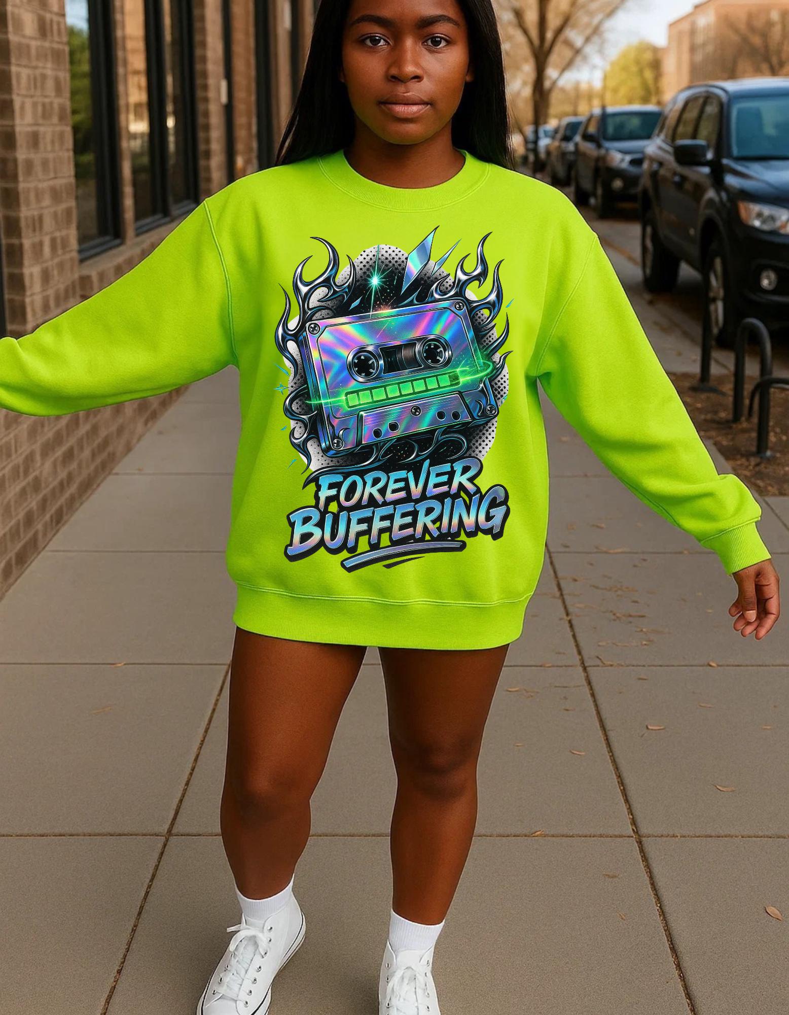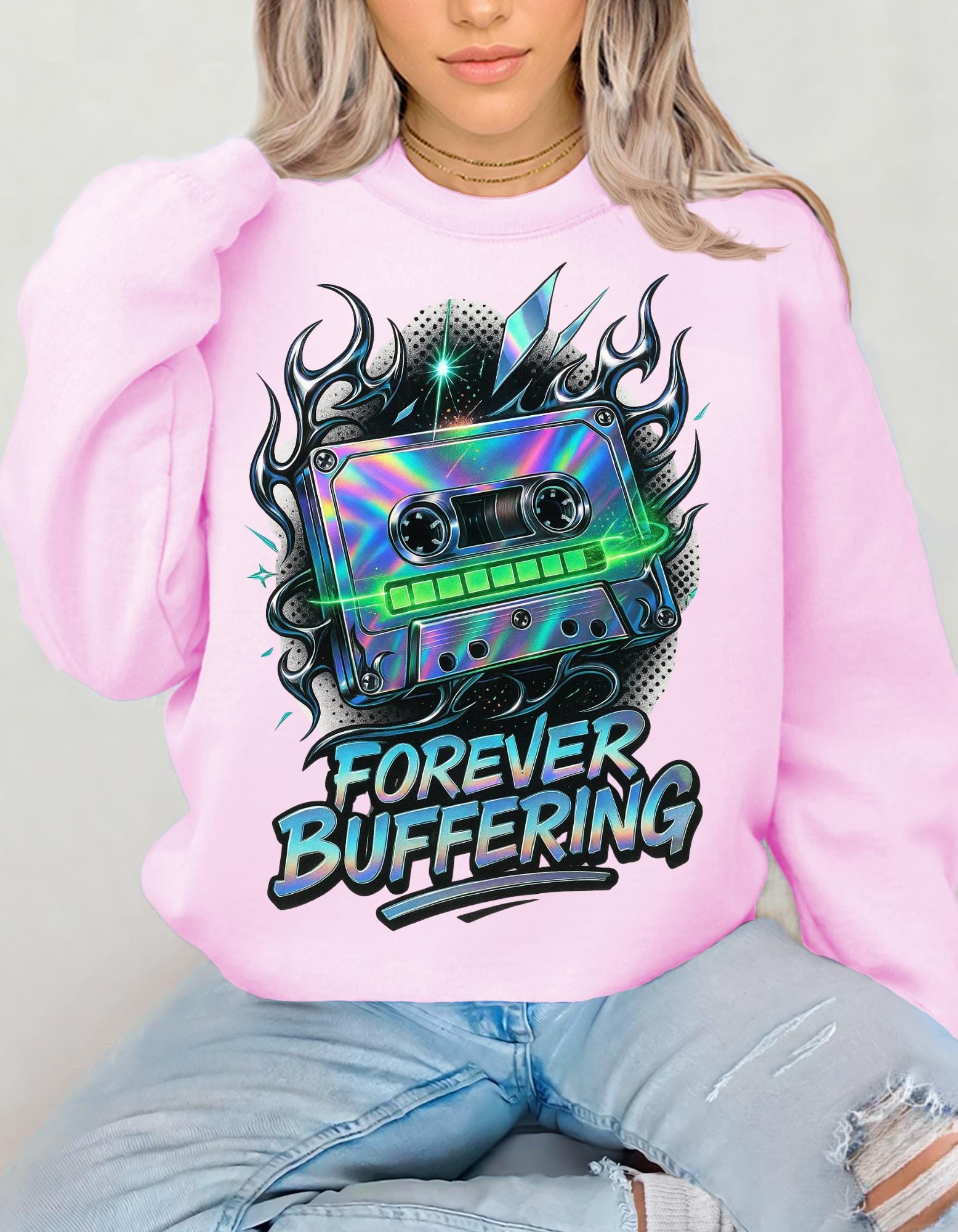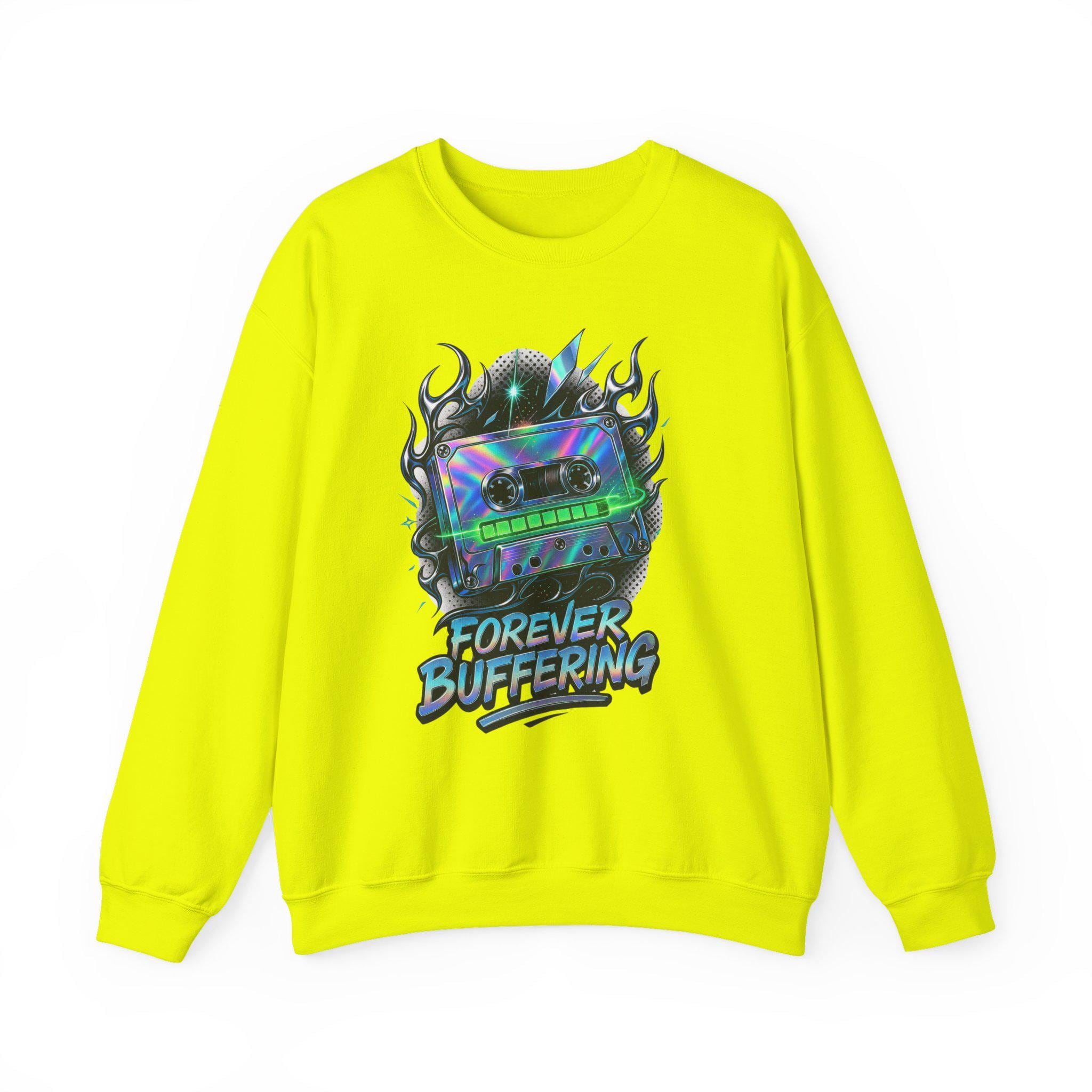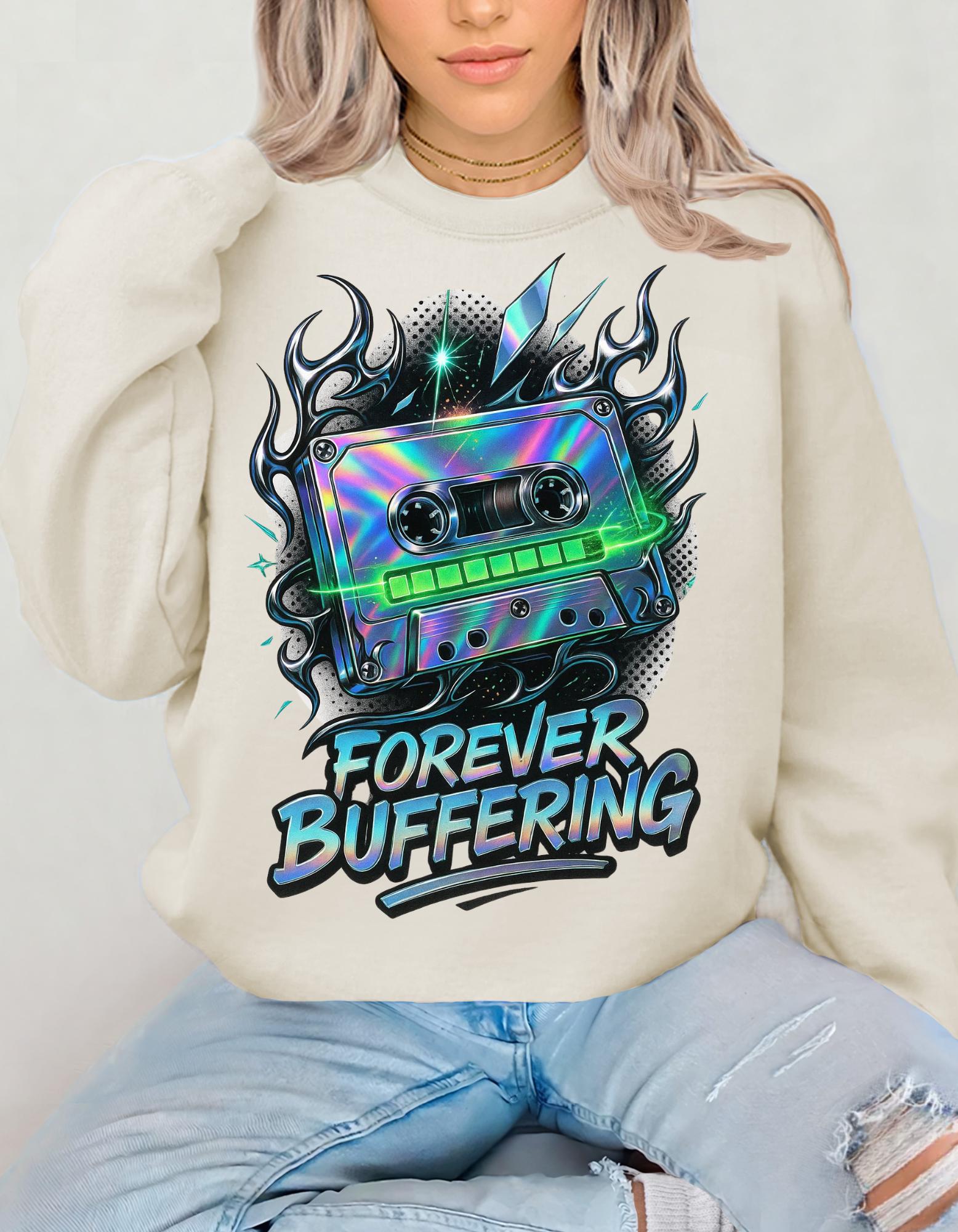 A nostalgic Sweatshirt featuring a design of MixedTape, forever buffering, y2k chrome. Perfect for those who love the Y2K aesthetic and want to relive the past. Ideal for adults looking for a comfortable and durable sweatshirt for everyday wear. Great for nostalgic holidays like Throwback Thursday or any casual occasion where you want to showcase your love for the early 2000s.