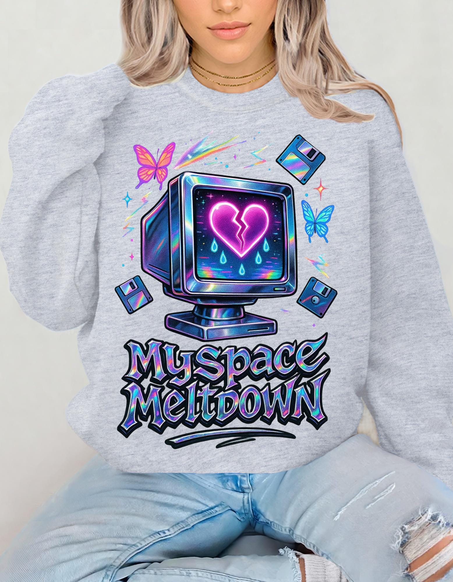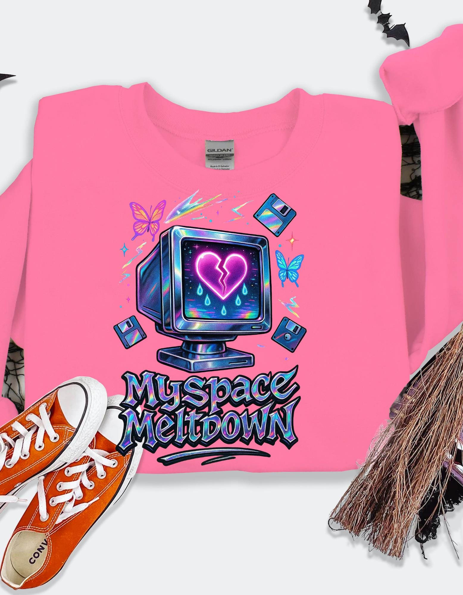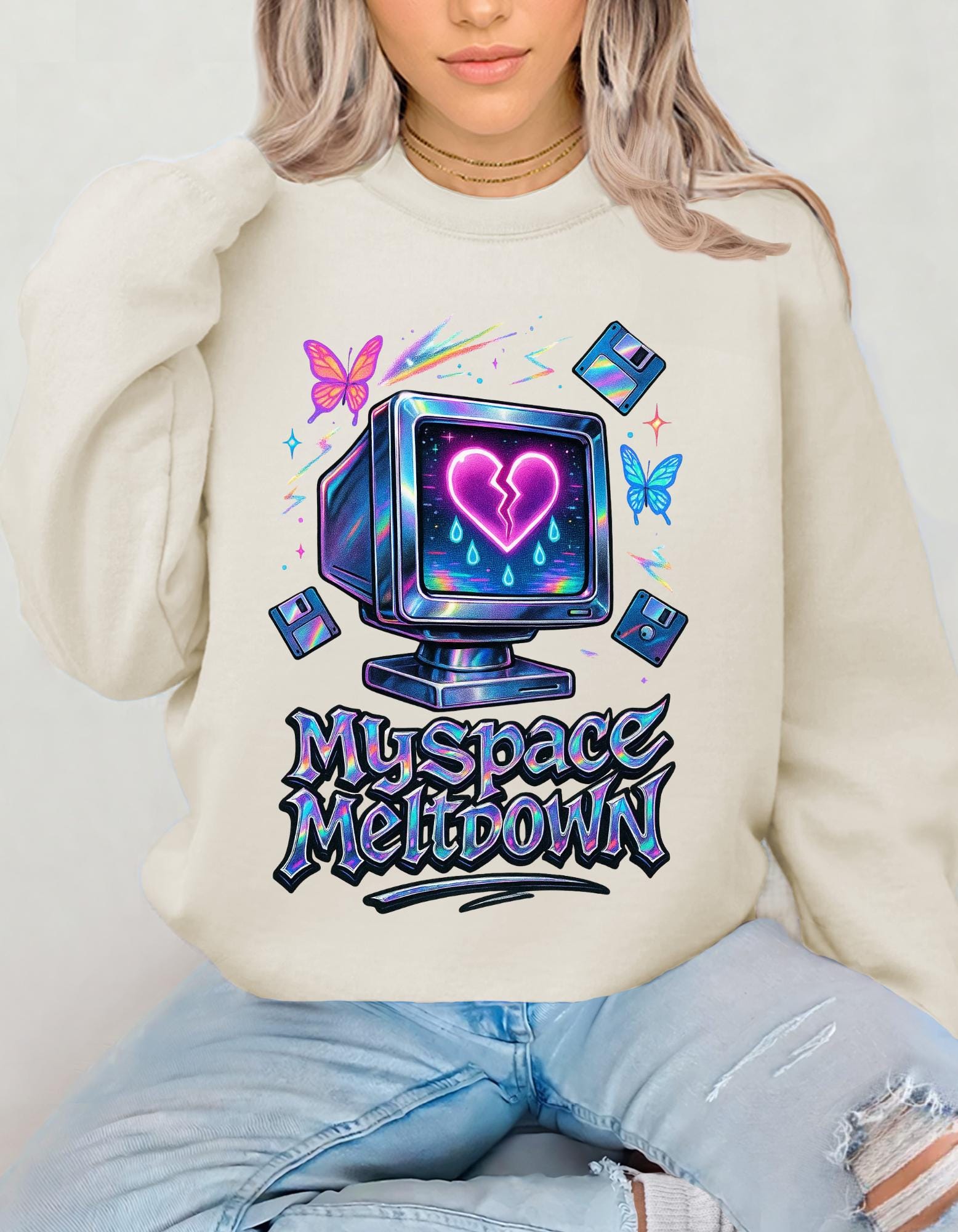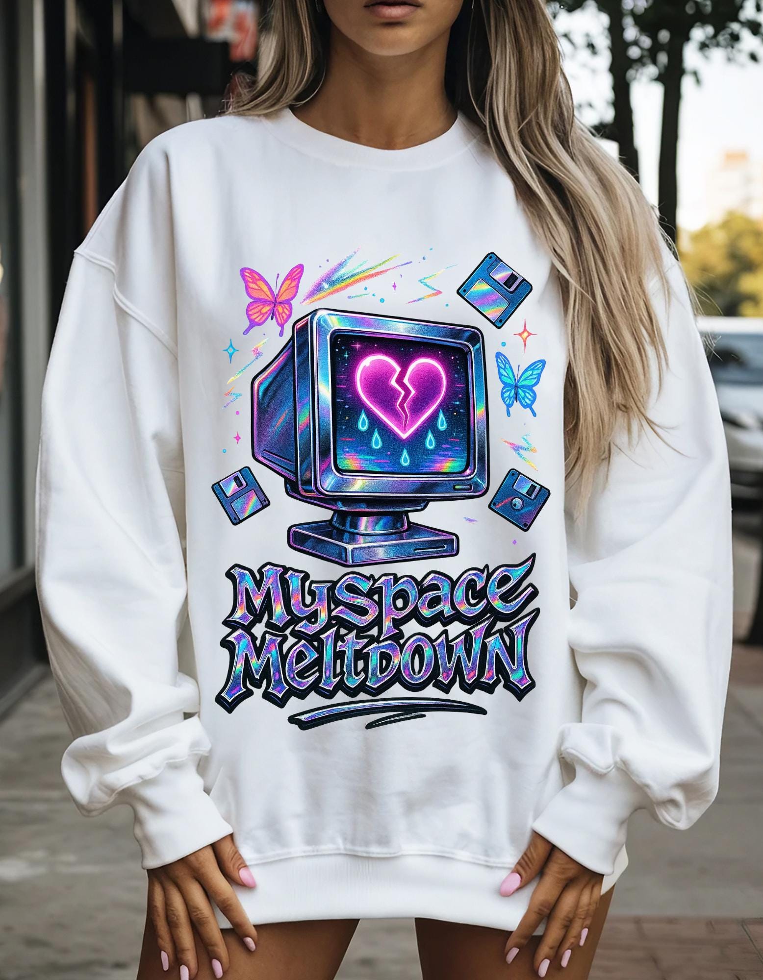 A nostalgic 'Myspace meltdown,'90s computer design on a comfortable and durable heavy blend crewneck sweatshirt. Perfect for adults who love retro tech vibes and want to stay cozy during the colder seasons. Ideal for casual wear or as a unique gift for tech enthusiasts. Relevant for occasions like birthdays, holidays, or everyday wear.