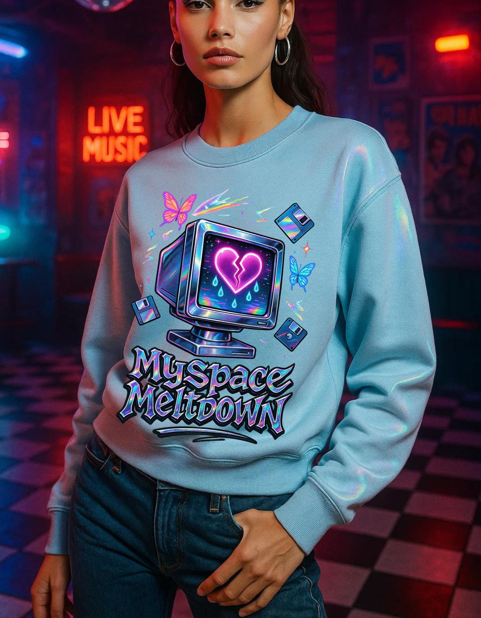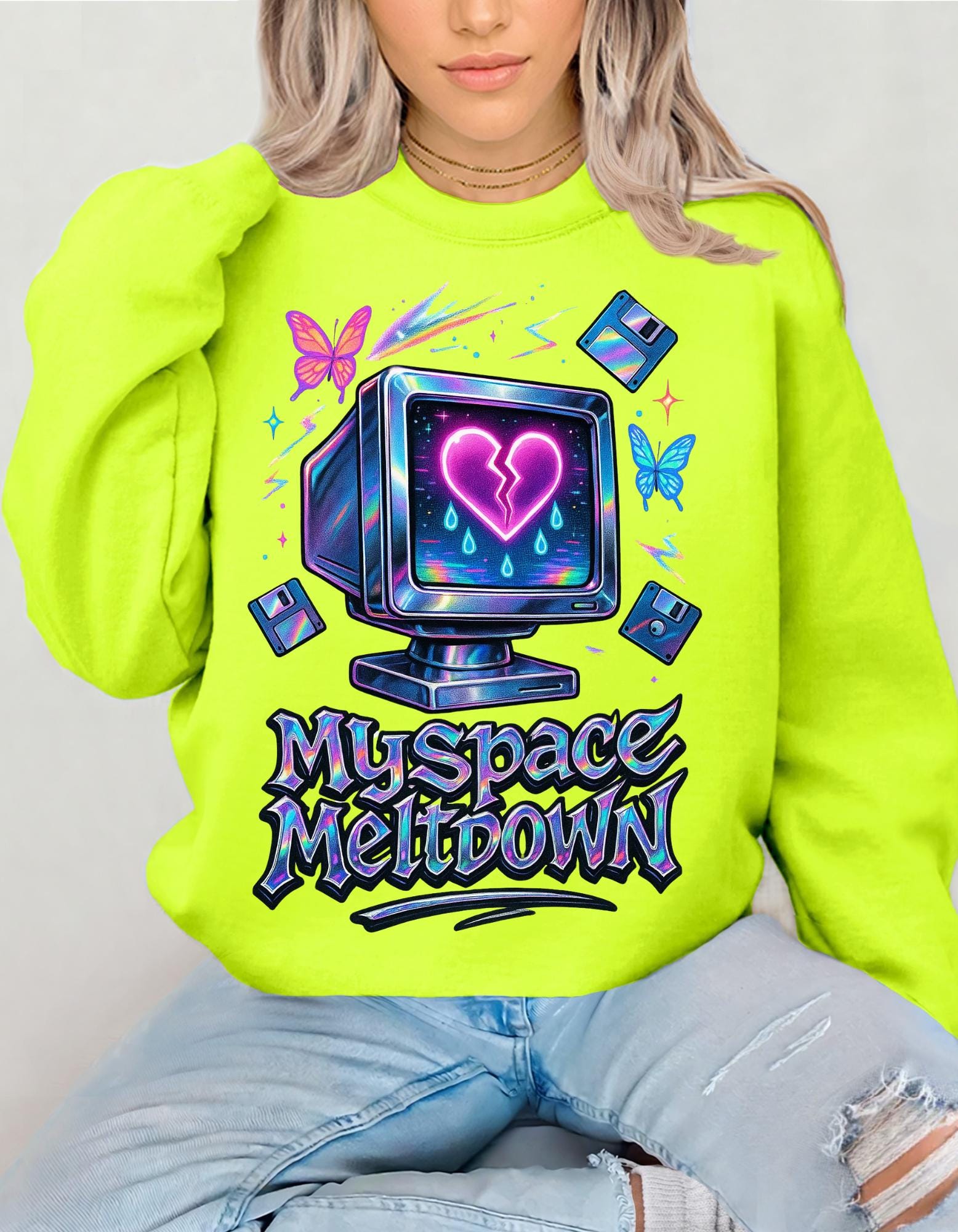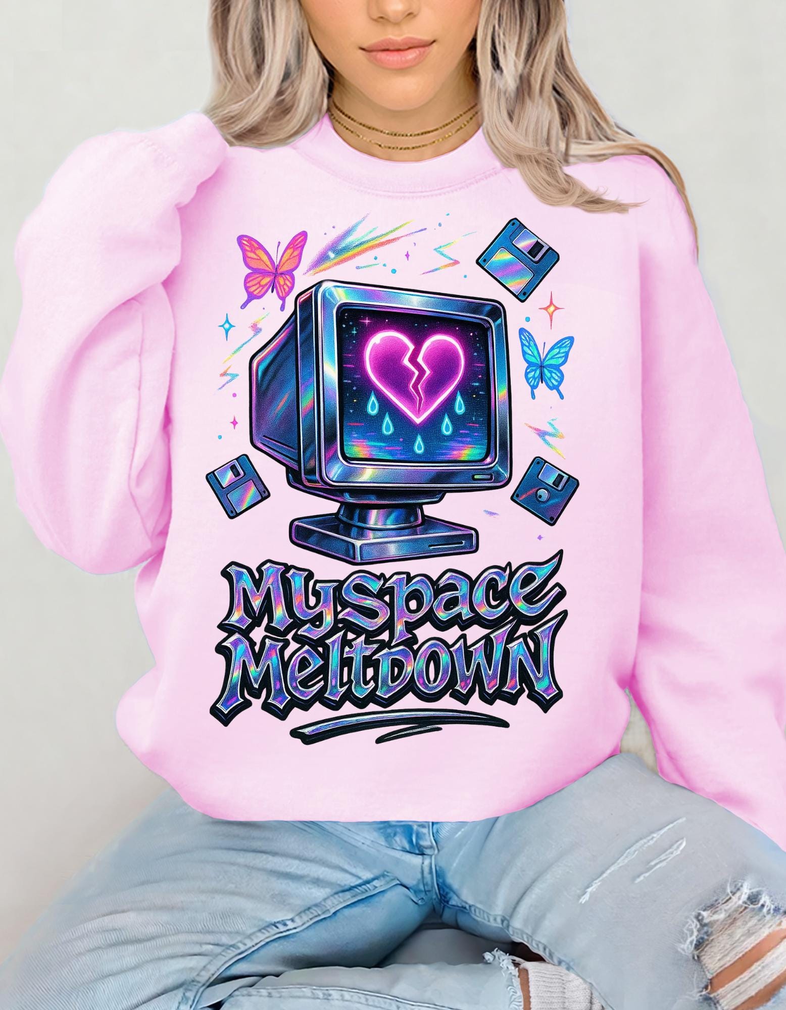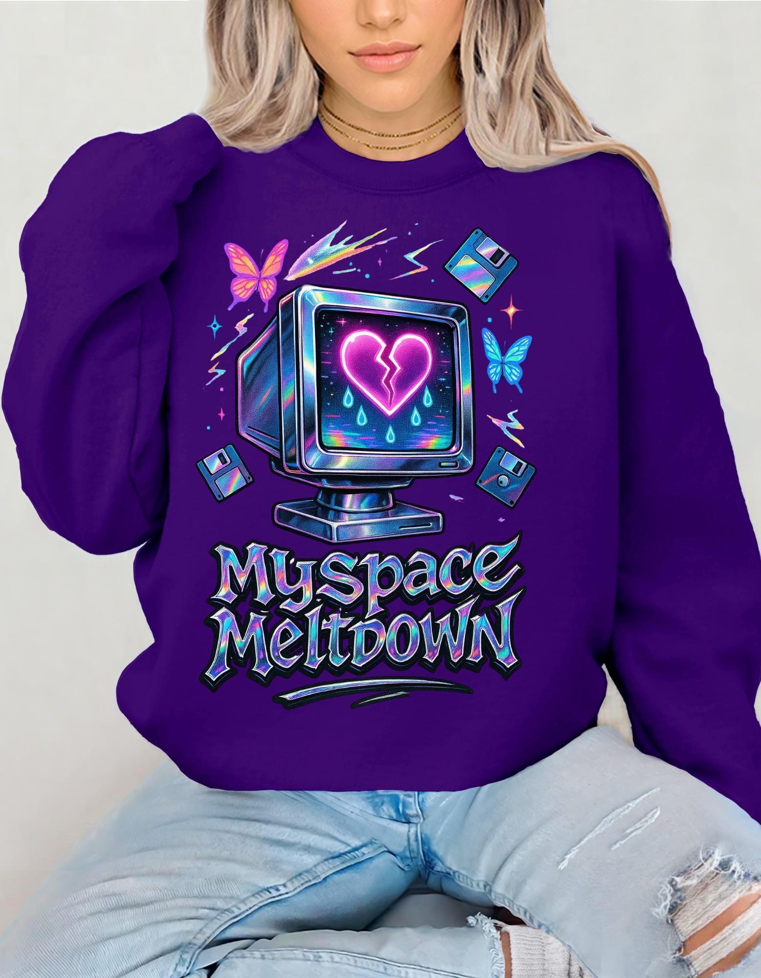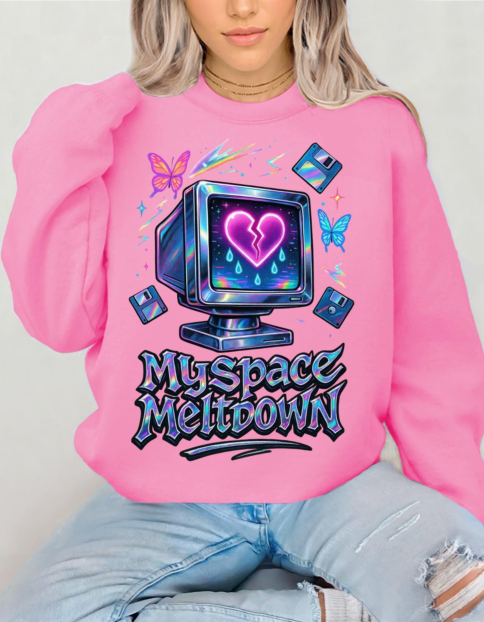 A nostalgic 'Myspace meltdown,'90s computer design on a comfortable and durable heavy blend crewneck sweatshirt. Perfect for adults who love retro tech vibes and want to stay cozy during the colder seasons. Ideal for casual wear or as a unique gift for tech enthusiasts. Relevant for occasions like birthdays, holidays, or everyday wear.
