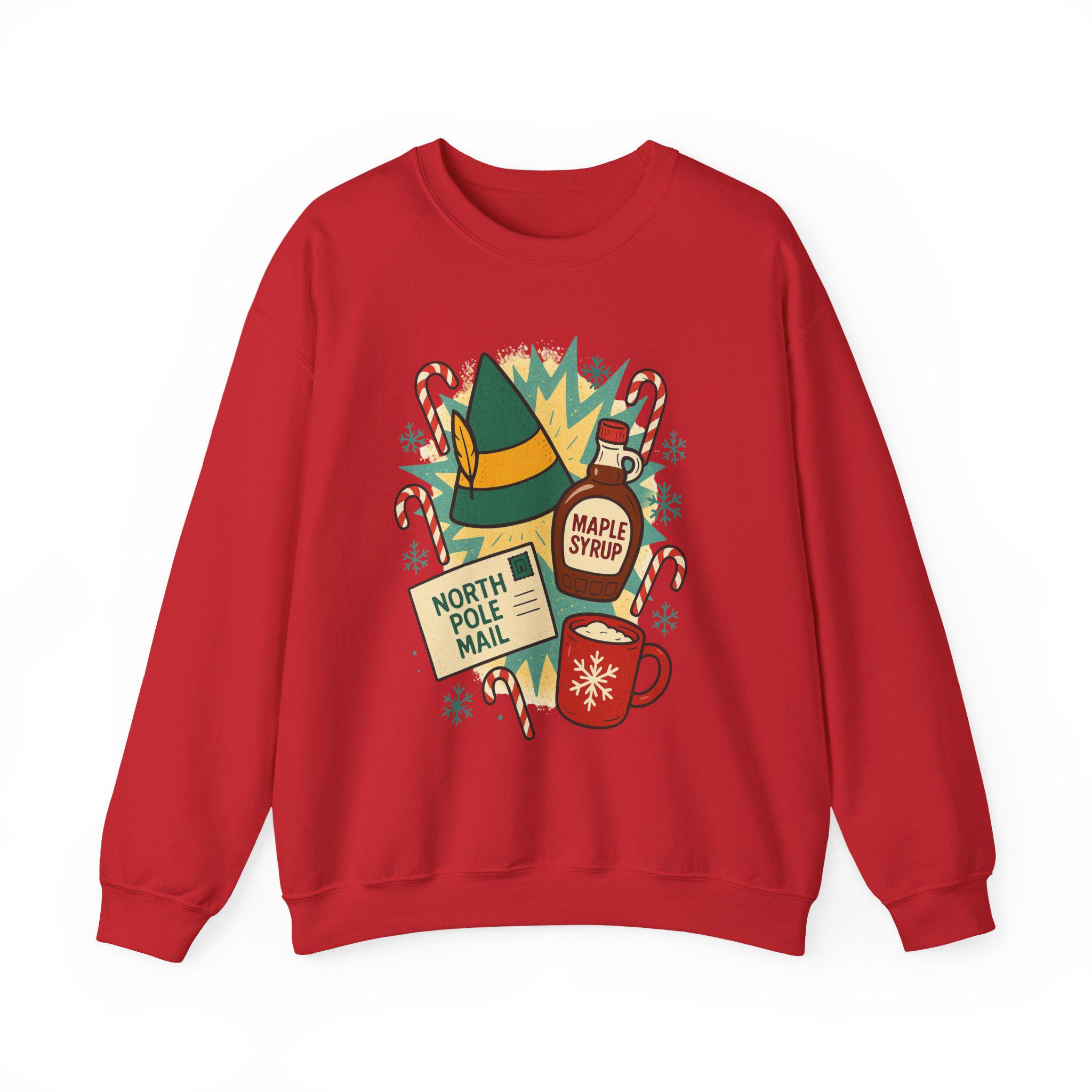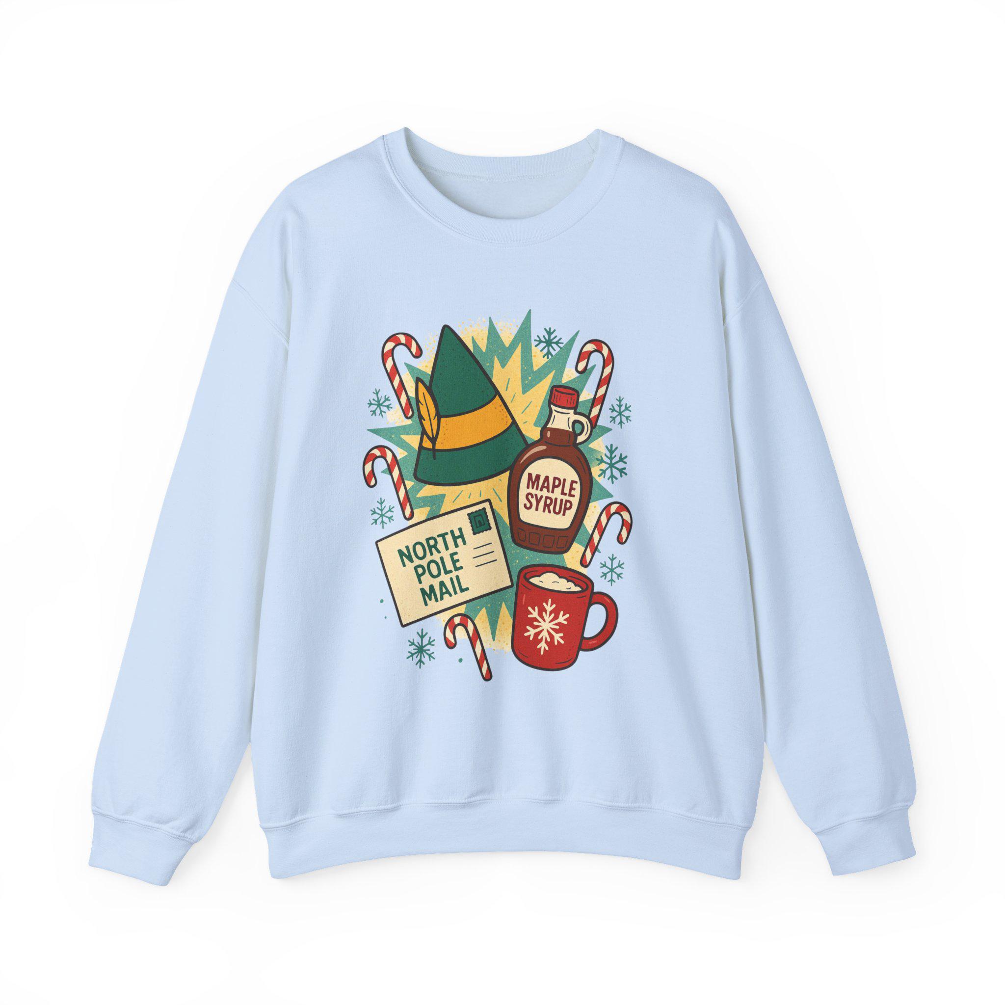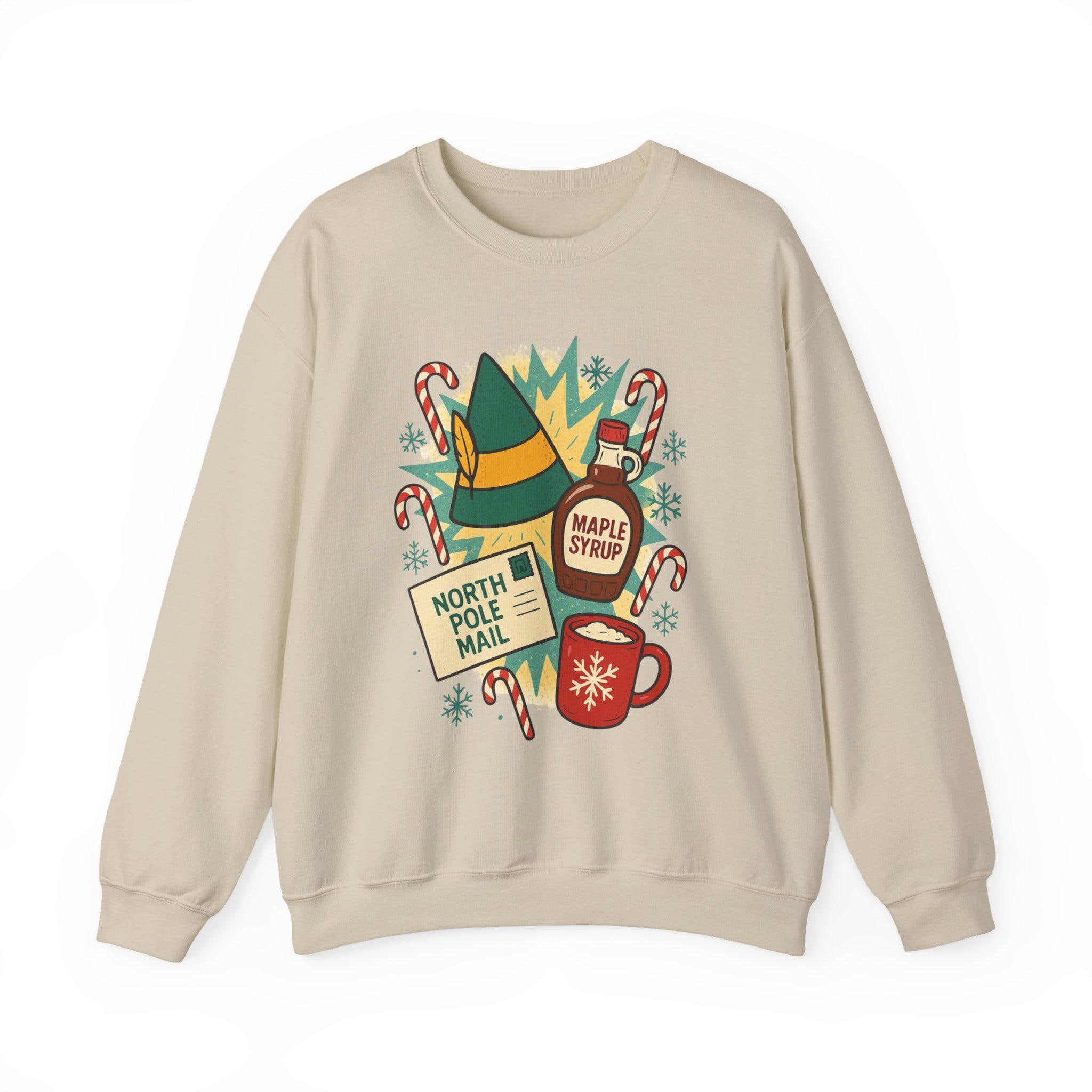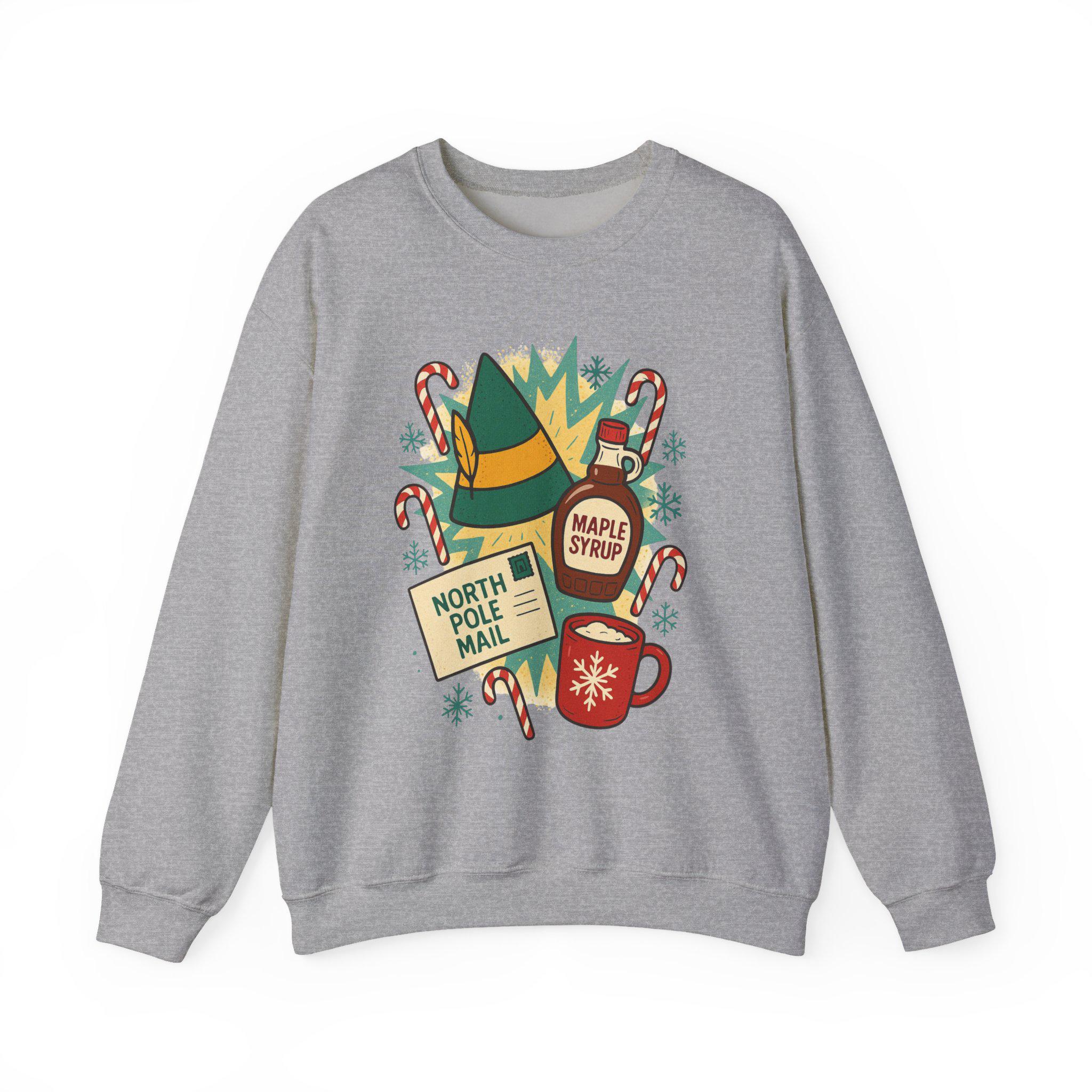 This Elf maple syrup-themed sweatshirt is perfect for adults who enjoy unique and whimsical designs. With a comfortable fit and durable construction, this sweatshirt is ideal for casual wear during the holiday season or any festive occasion. The ribbed knit collar and seamless design add to the overall appeal of this fun and cozy garment.