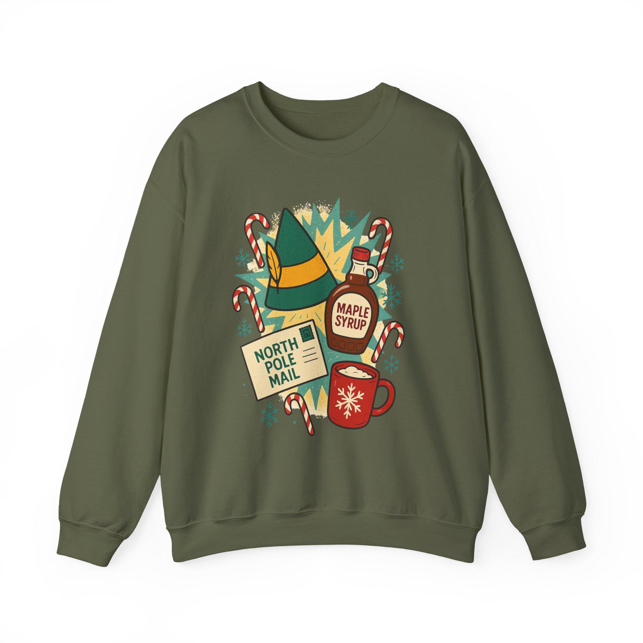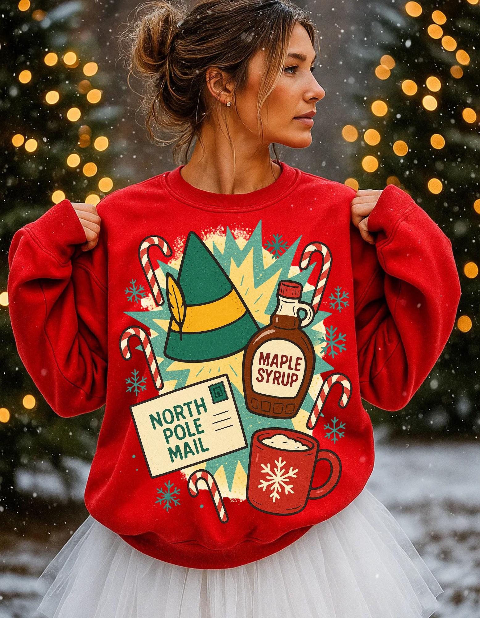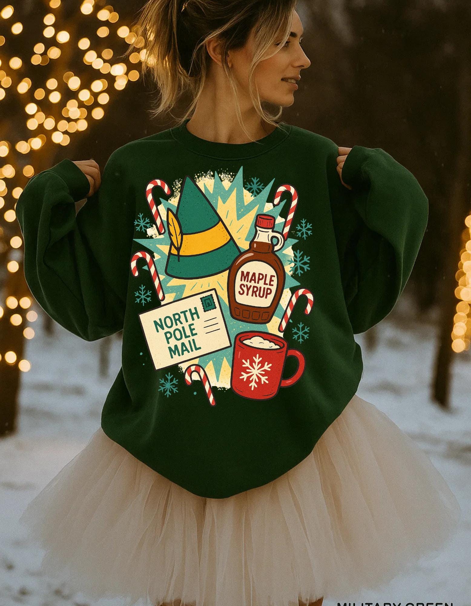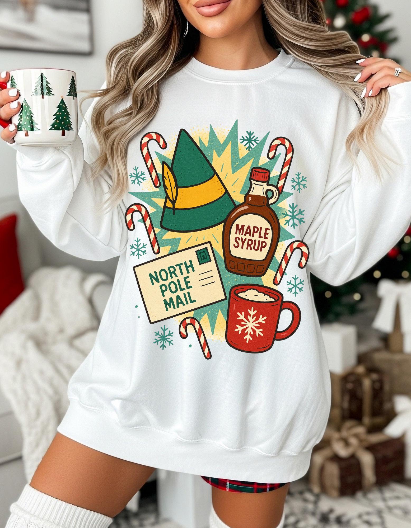 This Elf maple syrup-themed sweatshirt is perfect for adults who enjoy unique and whimsical designs. With a comfortable fit and durable construction, this sweatshirt is ideal for casual wear during the holiday season or any festive occasion. The ribbed knit collar and seamless design add to the overall appeal of this fun and cozy garment.
