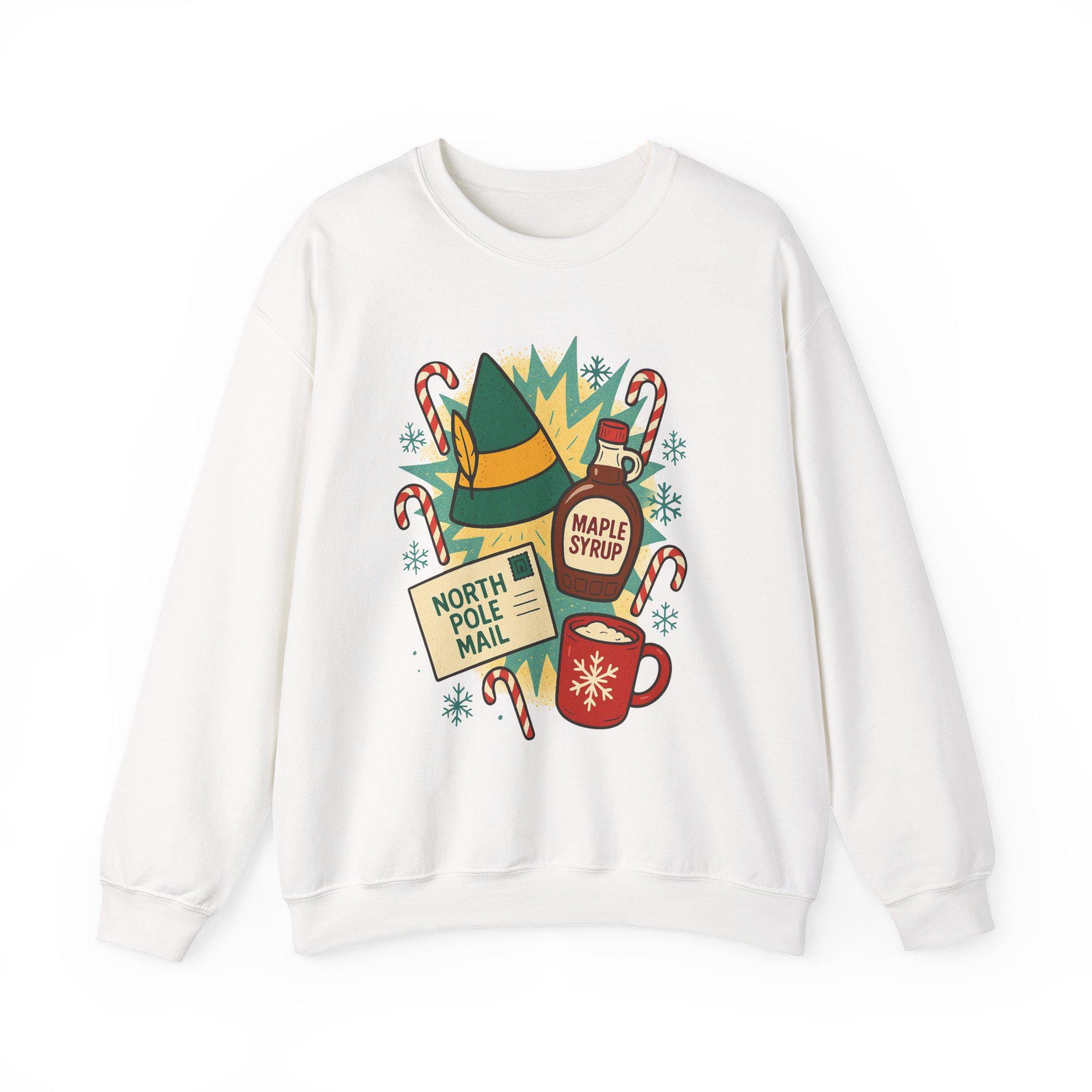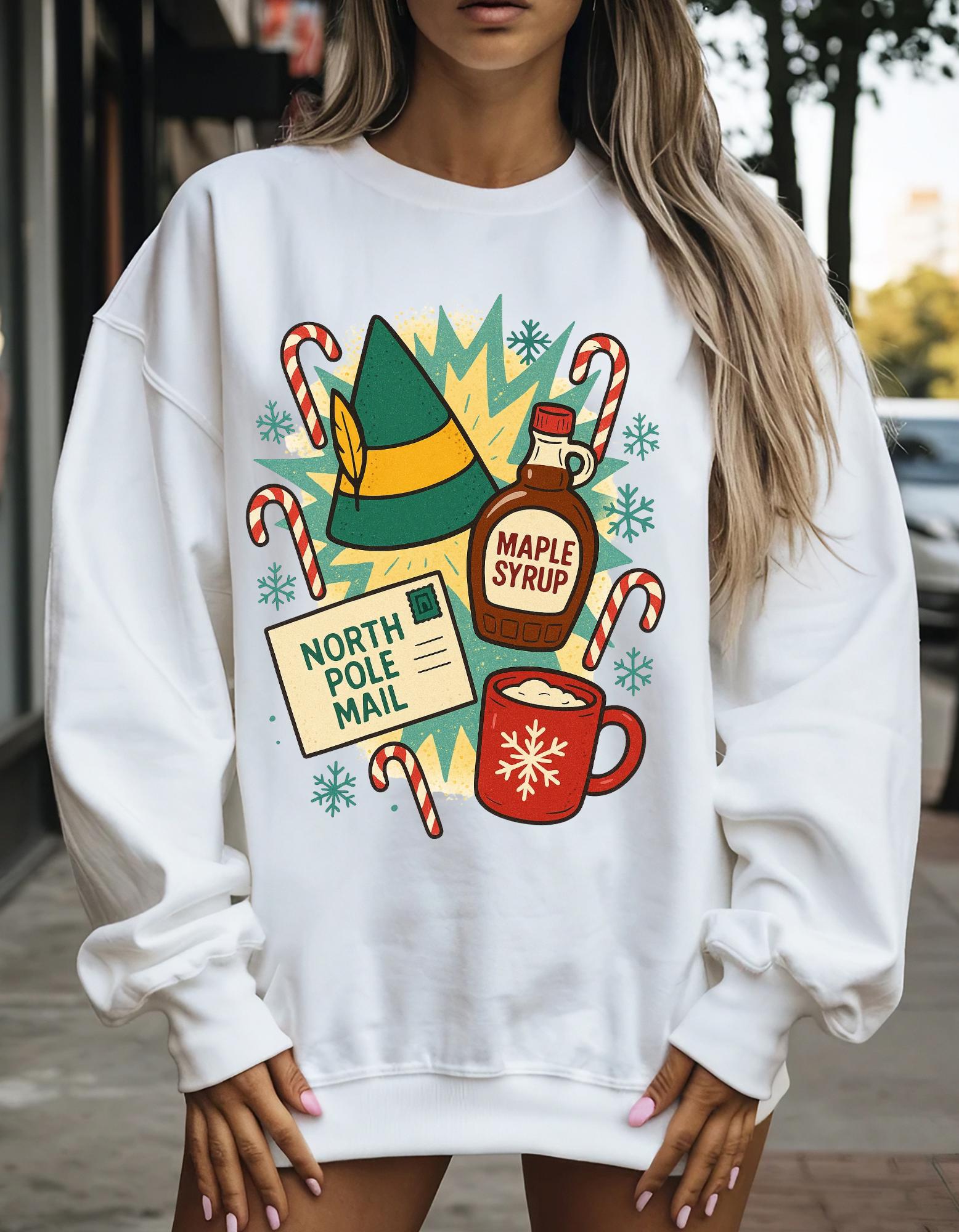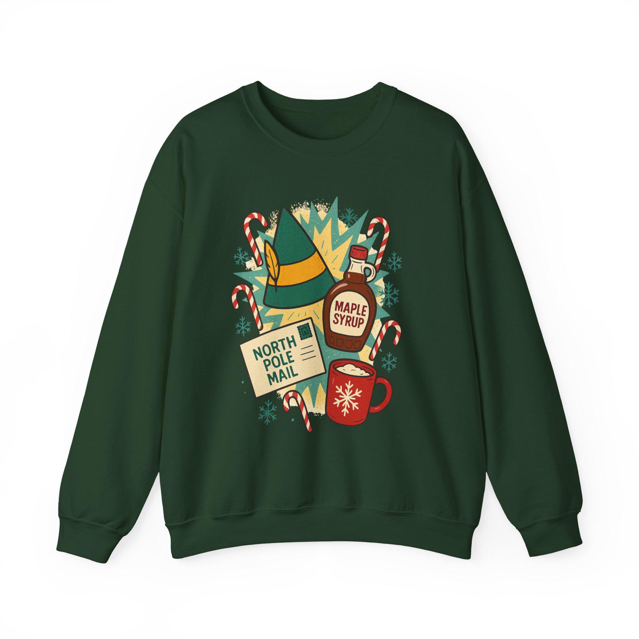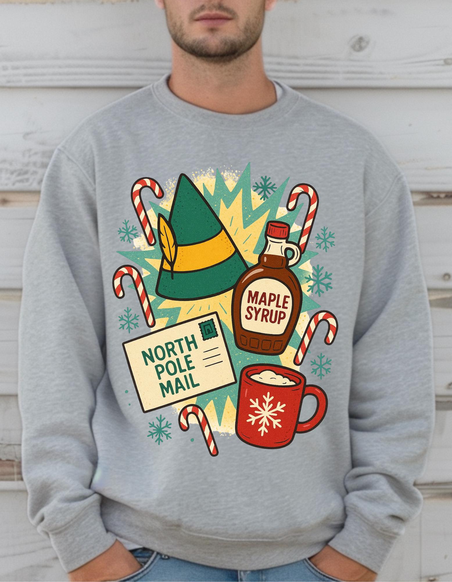 This Elf maple syrup-themed sweatshirt is perfect for adults who enjoy unique and whimsical designs. With a comfortable fit and durable construction, this sweatshirt is ideal for casual wear during the holiday season or any festive occasion. The ribbed knit collar and seamless design add to the overall appeal of this fun and cozy garment.
