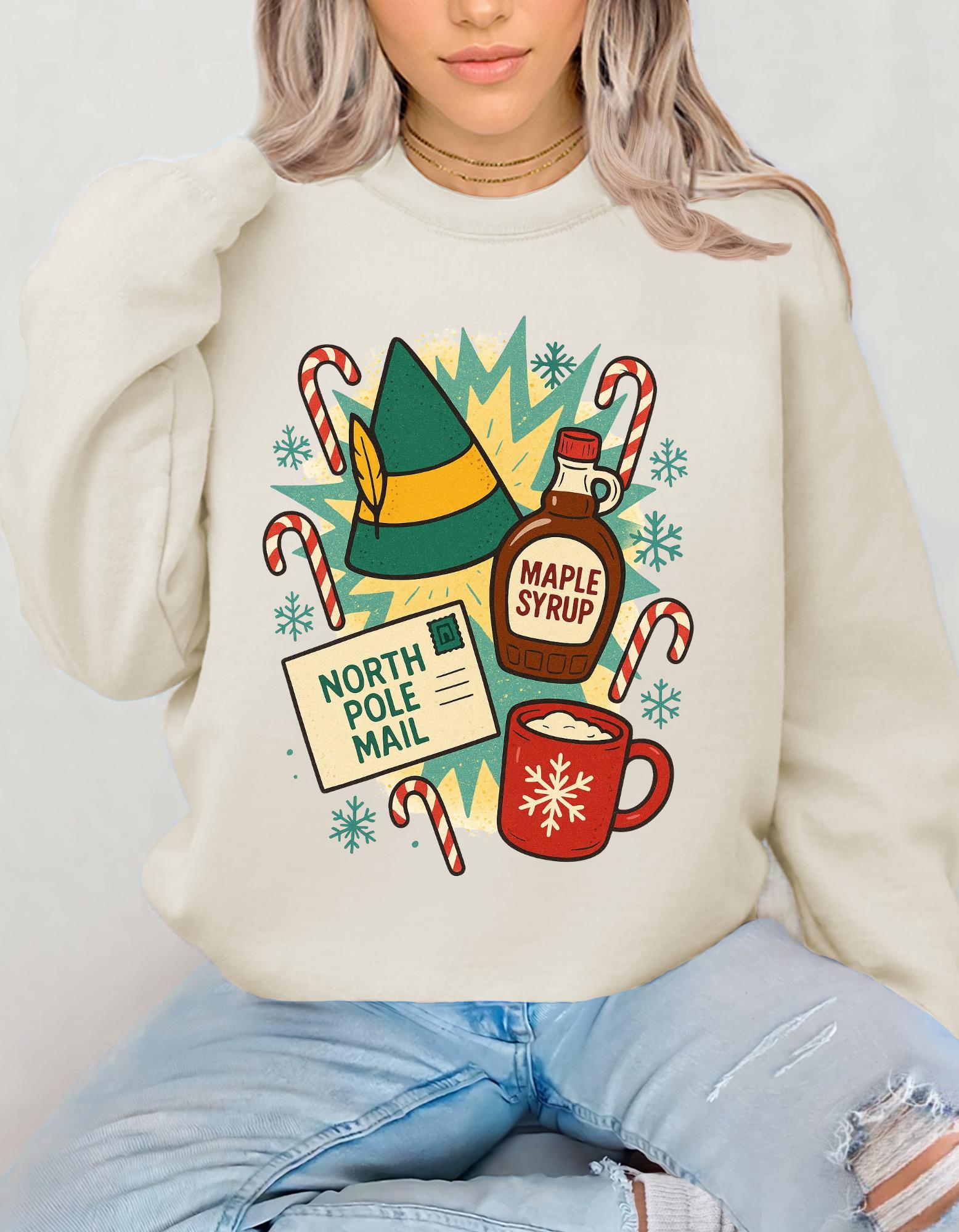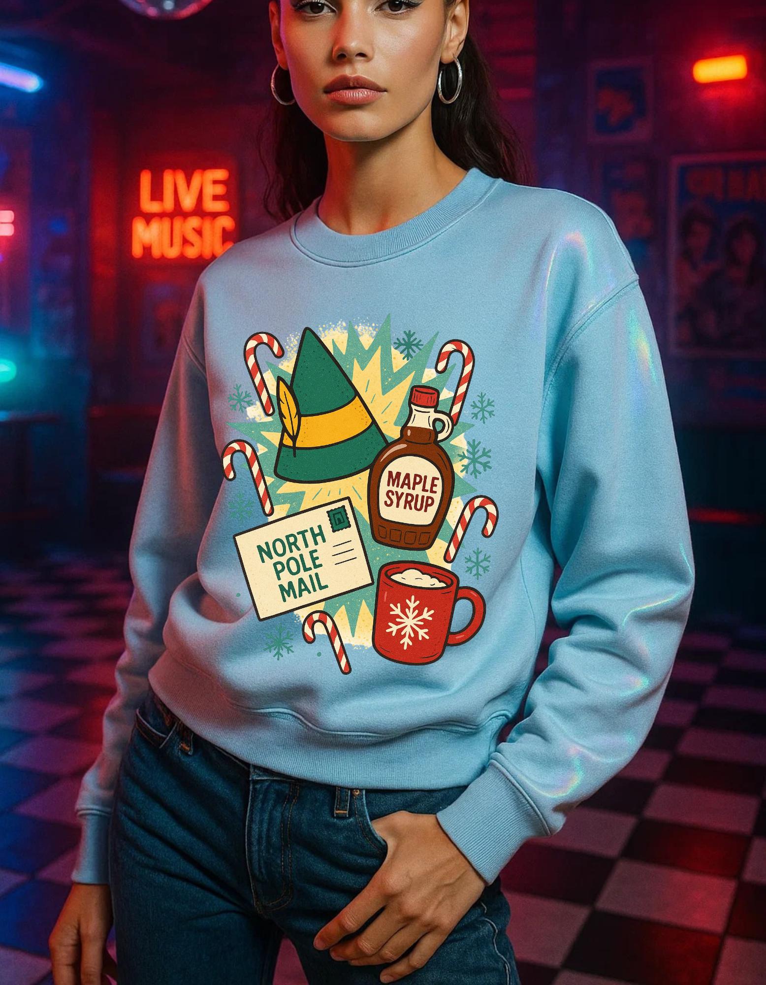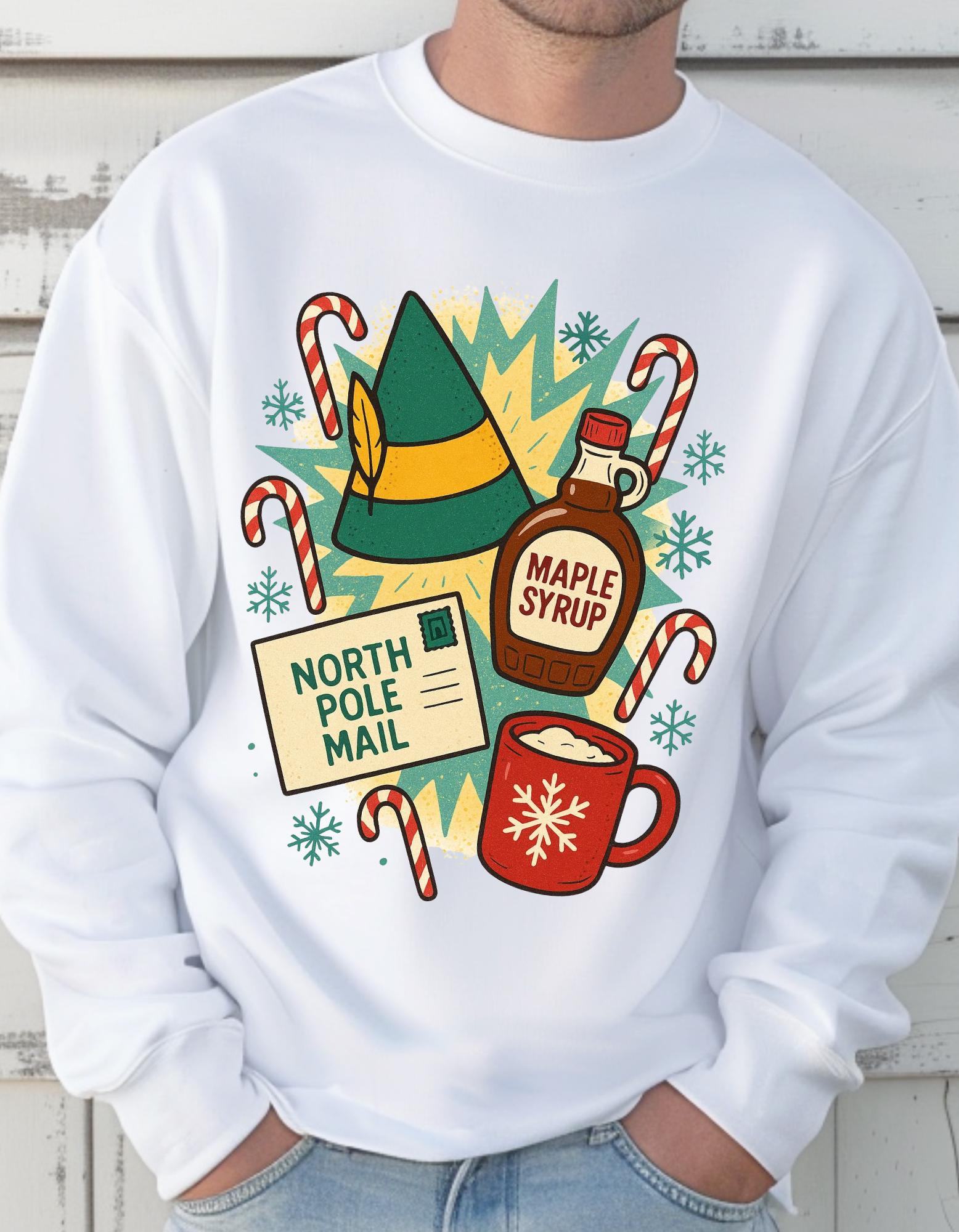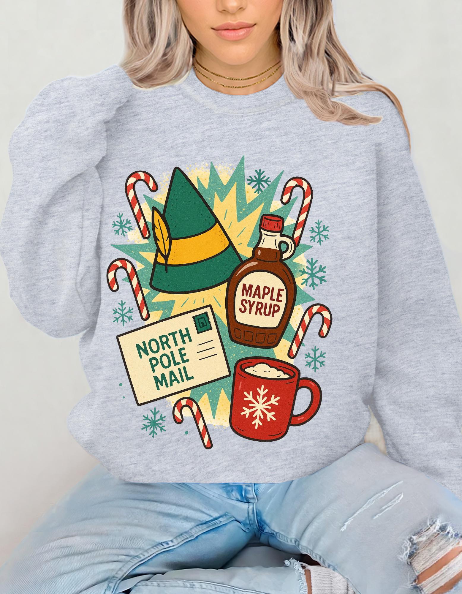 This Elf maple syrup-themed sweatshirt is perfect for adults who enjoy unique and whimsical designs. With a comfortable fit and durable construction, this sweatshirt is ideal for casual wear during the holiday season or any festive occasion. The ribbed knit collar and seamless design add to the overall appeal of this fun and cozy garment.
