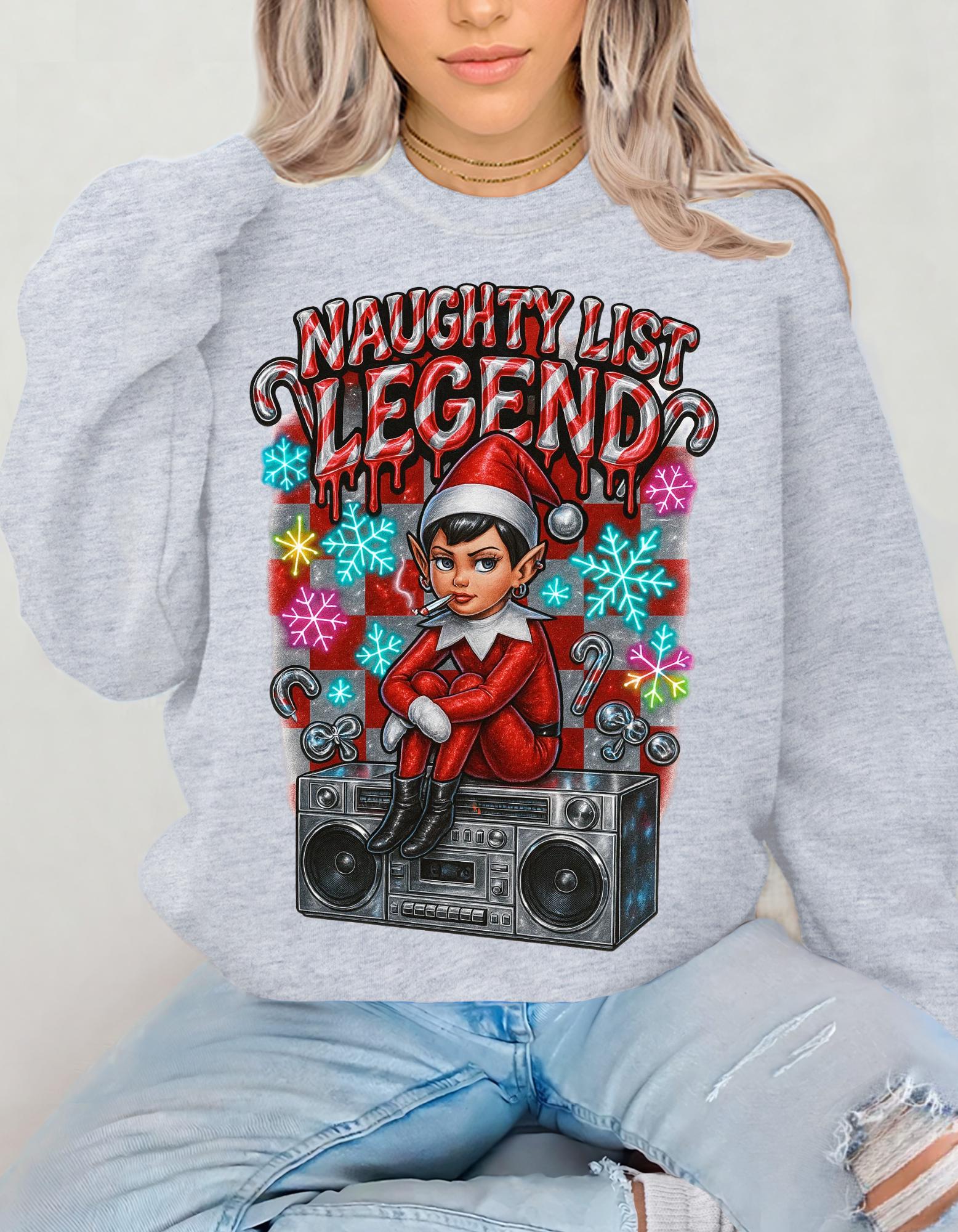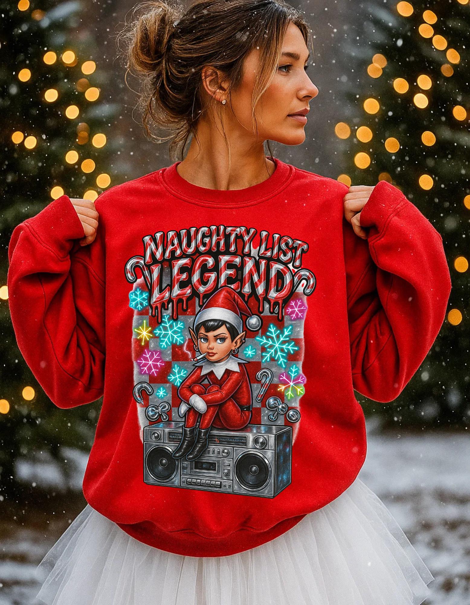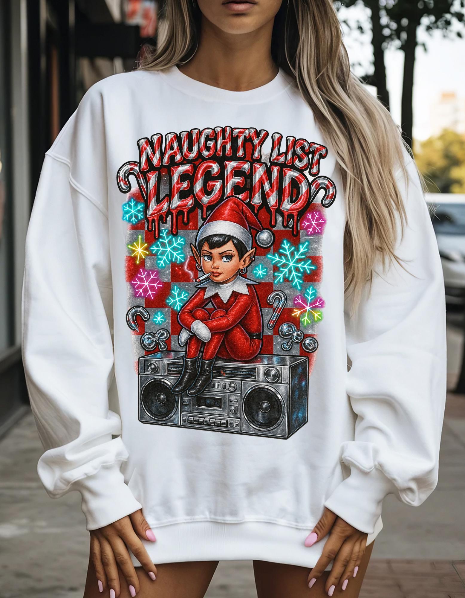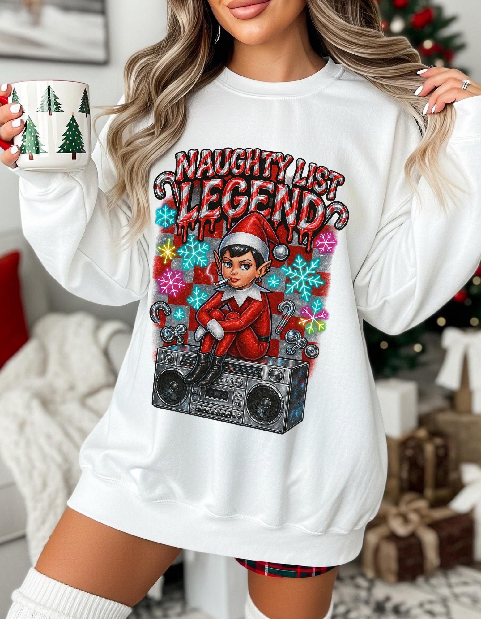 Get into the holiday spirit with this Naughty List themed sweatshirt featuring elves and a Y2K rebel vibe. Perfect for adults looking to add a touch of whimsy and nostalgia to their wardrobe during the festive season.