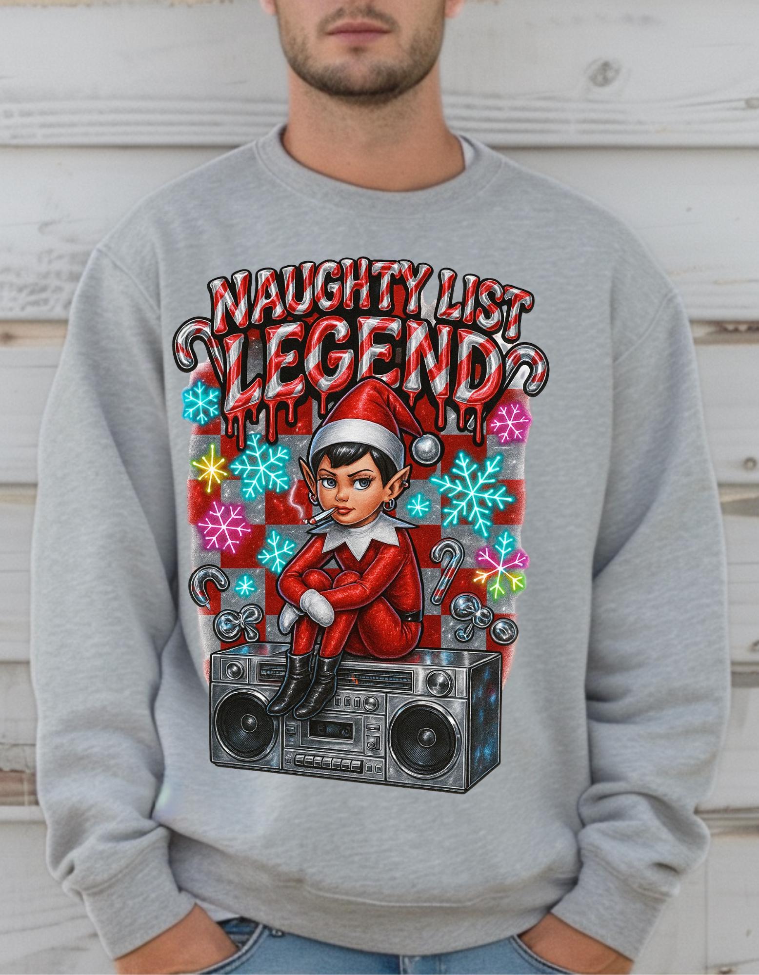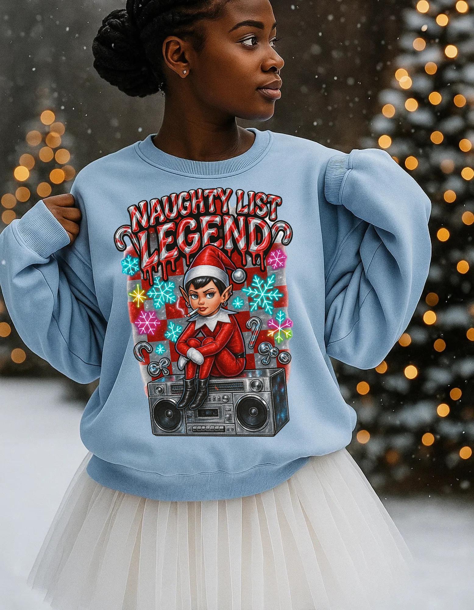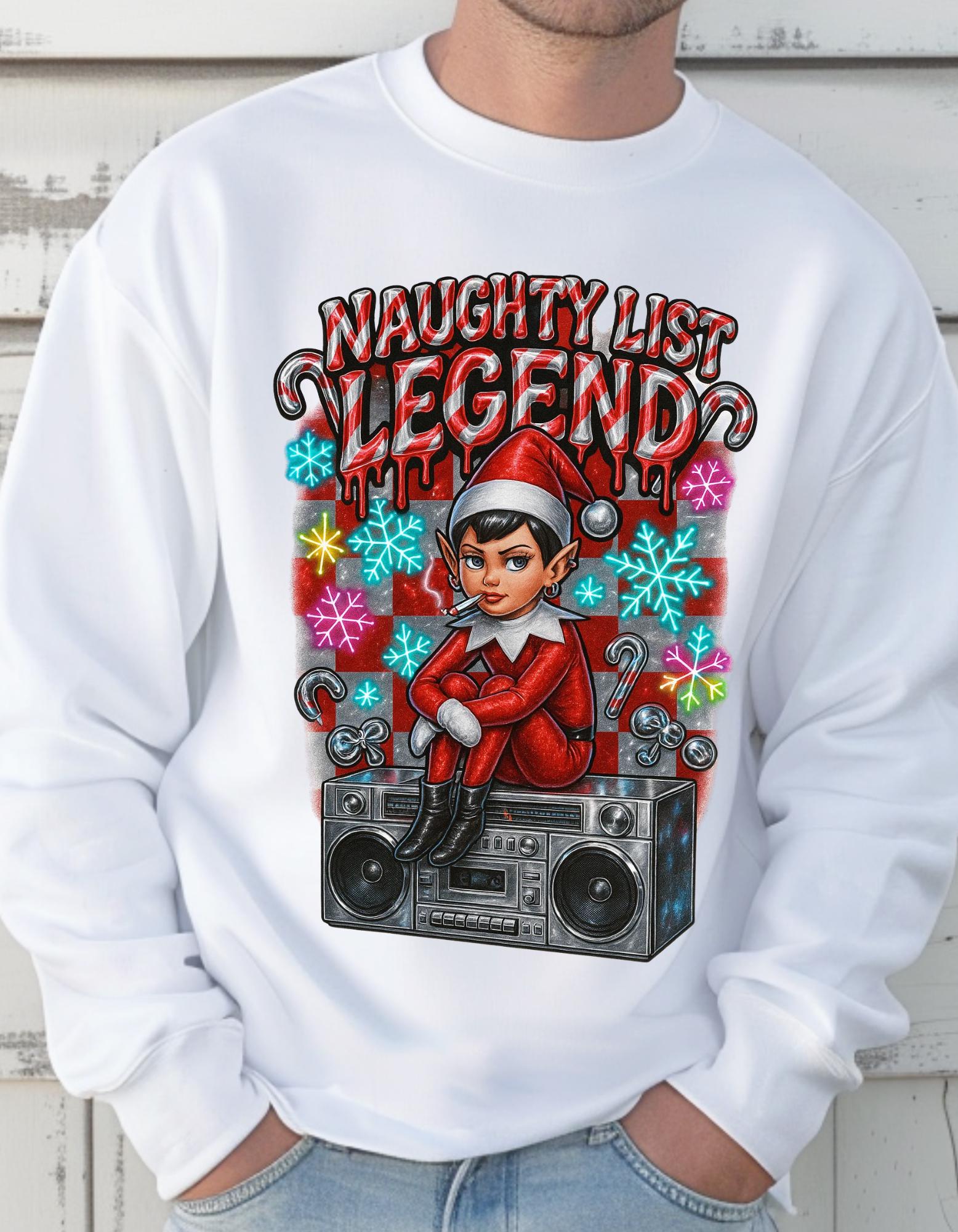 Get into the holiday spirit with this Naughty List themed sweatshirt featuring elves and a Y2K rebel vibe. Perfect for adults looking to add a touch of whimsy and nostalgia to their wardrobe during the festive season.