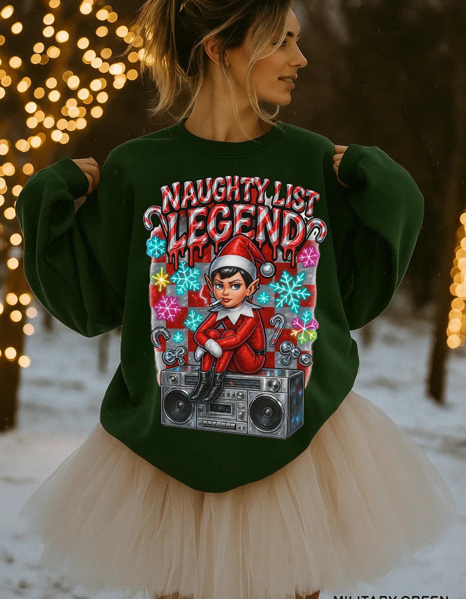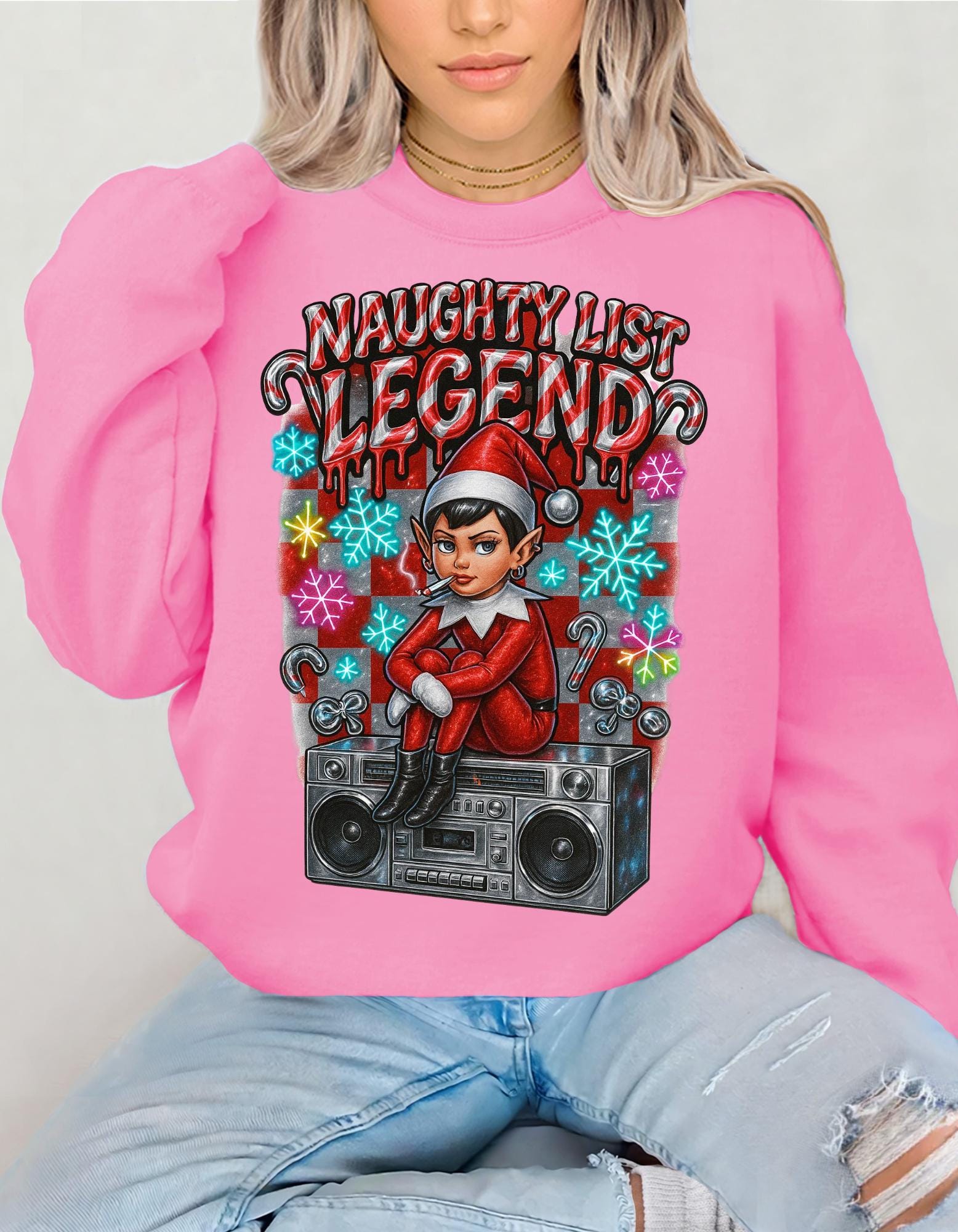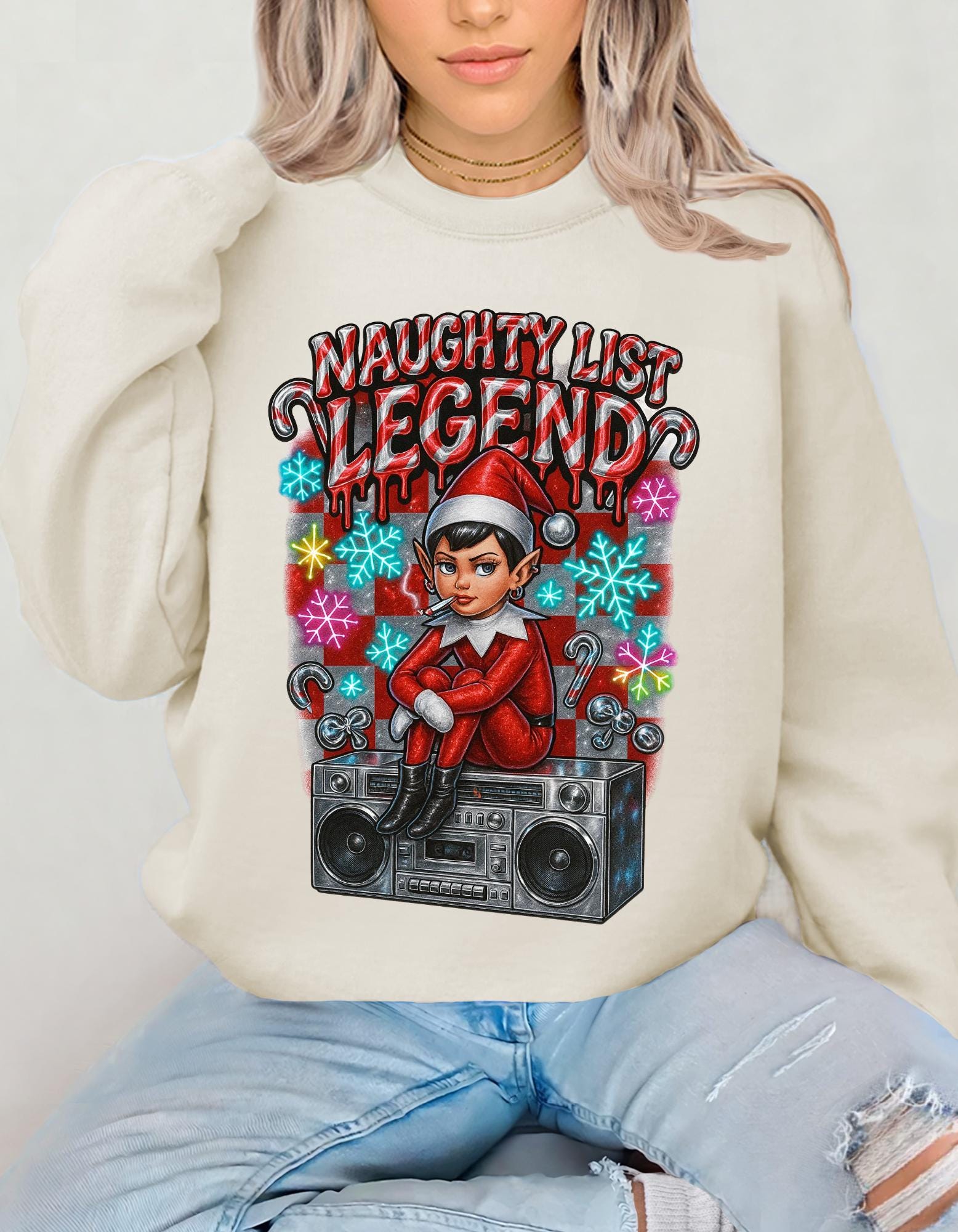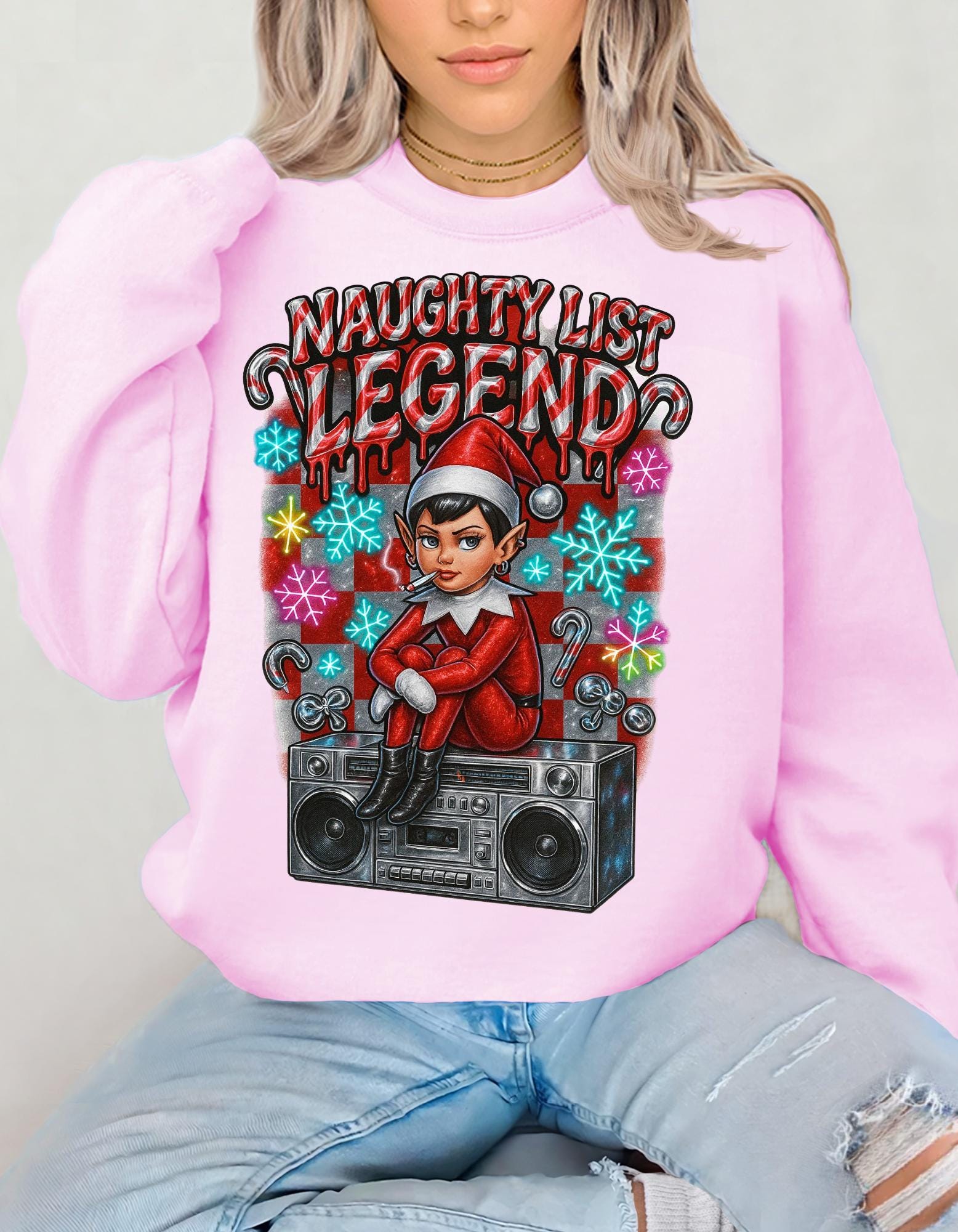 Get into the holiday spirit with this Naughty List themed sweatshirt featuring elves and a Y2K rebel vibe. Perfect for adults looking to add a touch of whimsy and nostalgia to their wardrobe during the festive season.